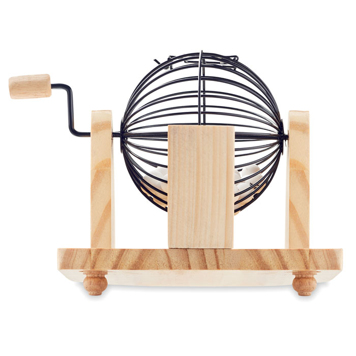 Bambusowy zestaw do gry w bingo. Zawiera: maszynę do gry w bingo na bambusowej podstawie, kulki do gry (75 szt.), planszę główną, karty (18 szt.) i żetony do zaznaczania (150 szt.).