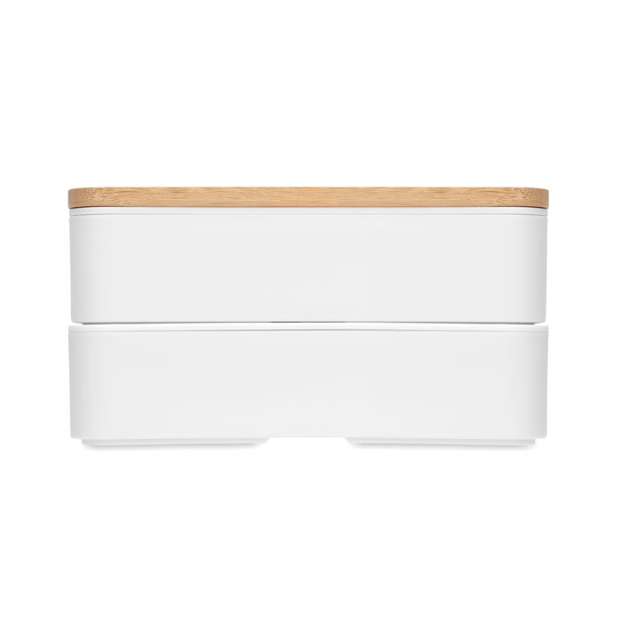 Dwupoziomowy pojemnik na lunch z PP z bambusową pokrywą, zawierający 1 wyjmowaną przegródkę z PP i 3 sztućce, z dołączaną opaską poliestrową. Pojemność 400 ml (2x).