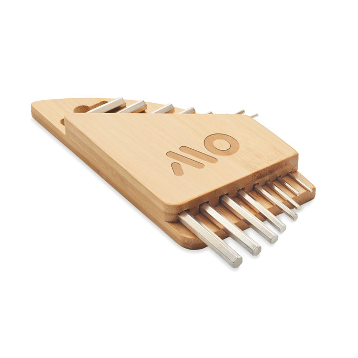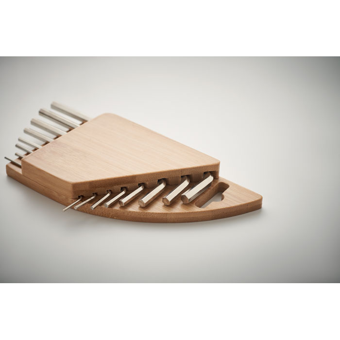 Zestaw kluczy sześciokątnych, imbusowych, w bambusowym uchwycie. Zawiera klucz sześciokątny ze stali węglowej z powłoką niklową o następujących rozmiarach: 1 ,5mm - 2mm - 2,5mm - 3mm - 4mm - 5mm - 5,5mm - 6mm.