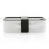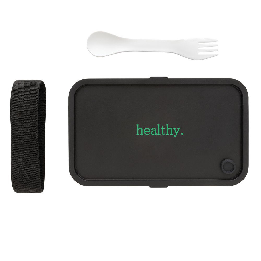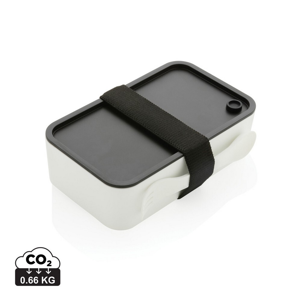 Pudełko śniadaniowe 1,2 L, lunchbox, wykonany w 93% z PP pochodzącego z recyklingu z certyfikatem GRS (Global Recycled Standard) który gwarantuje, że wykorzystane materiały pochodzą z recyklingu, w komplecie łyżkowidelec i elastyczny pasek, można myć w zmywarce i używać w kuchence mikrofalowej