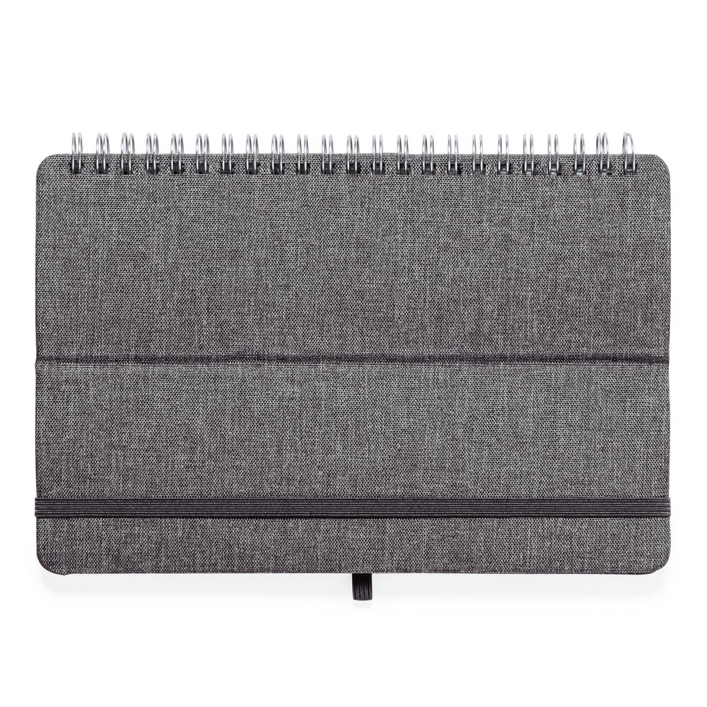 Notatnik RPET (ok. A5, 70 kartek w linie), stojak na telefon, stojak na tablet, twarda okładka, spiralne bindowanie, elastyczna opaska do zamykania
