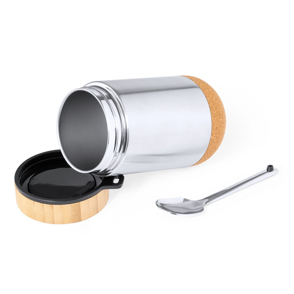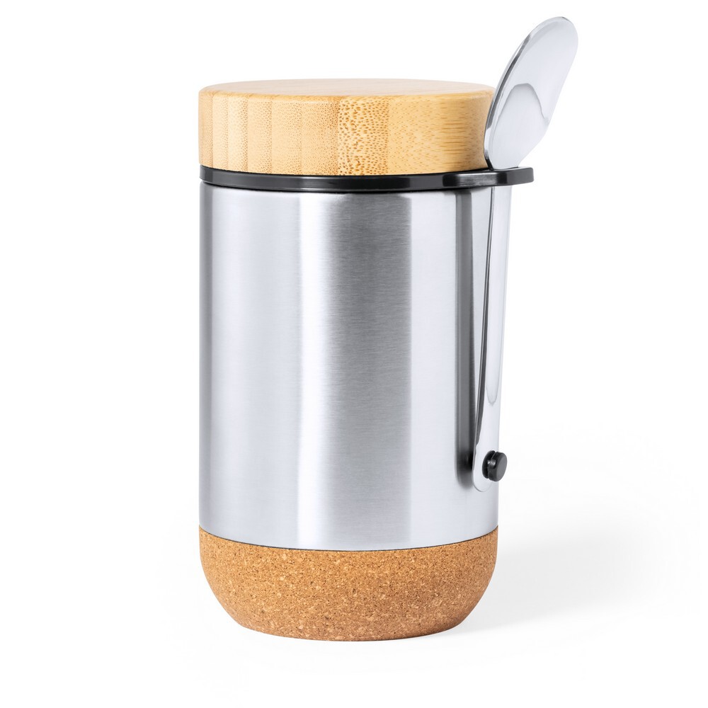 Pojemnik na żywność 450 ml z łyżką ze stali nierdzewnej w komplecie, ścianki ze stali nierdzewnej, bambusowe wieczko i korkowy detal, leakproof