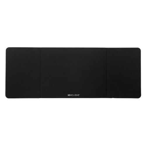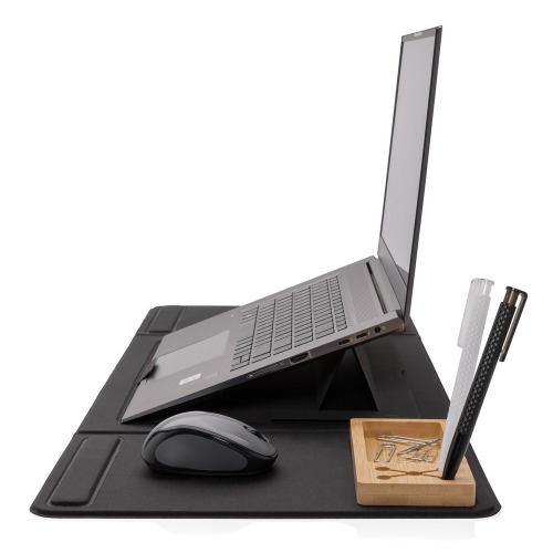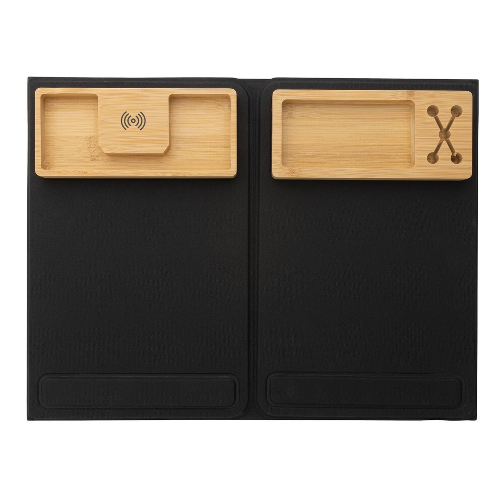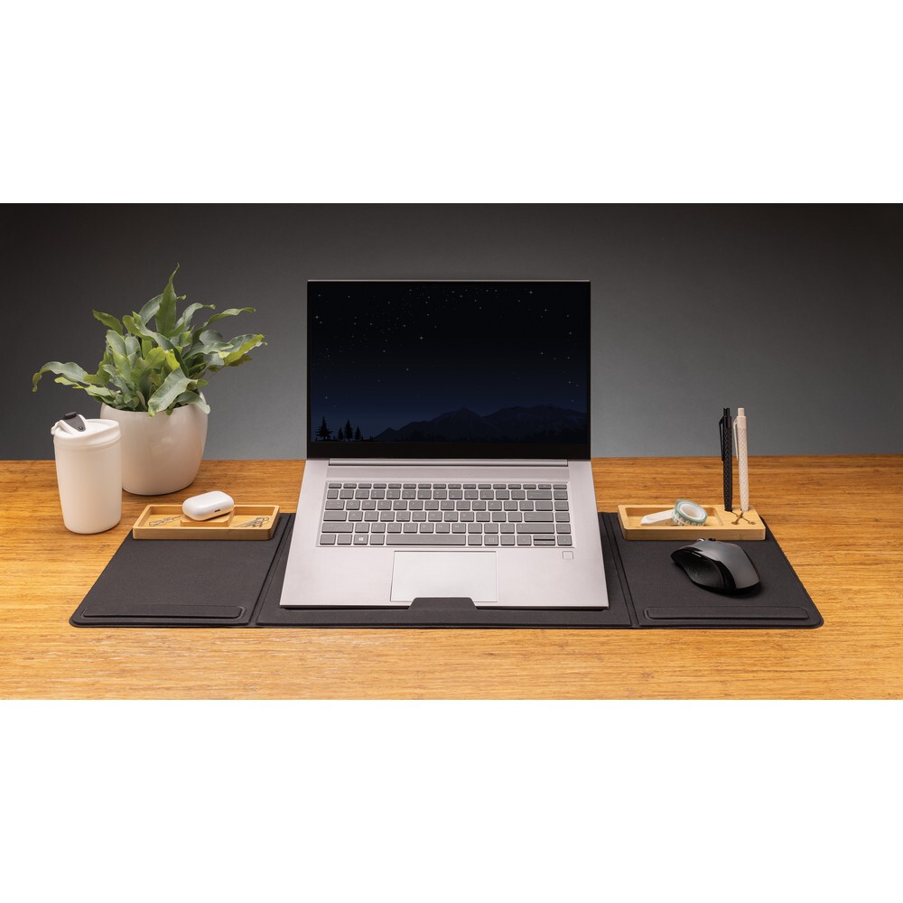 Składany organizer na biurko, podstawka na laptopa do 17”, bambusowa ładowarka bezprzewodowa 10W, bambusowy stojak na długopisy, ładowarka i stojak przymocowane na magnes, organizer wykonany z materiałów pochodzących z recyklingu do produkcji których zostało ponownie wykorzystanych 11 butelek PET o pojemności 0,5 l oraz zaoszczędzone zostało 6,6 l wody, dzięki zastosowaniu technologii śledzącej AWARE™ wykorzystane włókna są identyfikowalne z pochodzenia, 2% wpływów z każdego sprzedanego produktu jest przekazywane na rzecz Water.org, kabel micro USB w komplecie, nie zawiera PVC