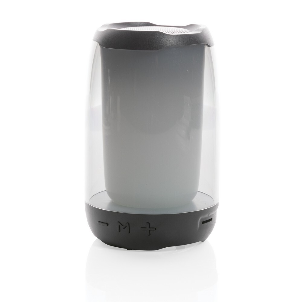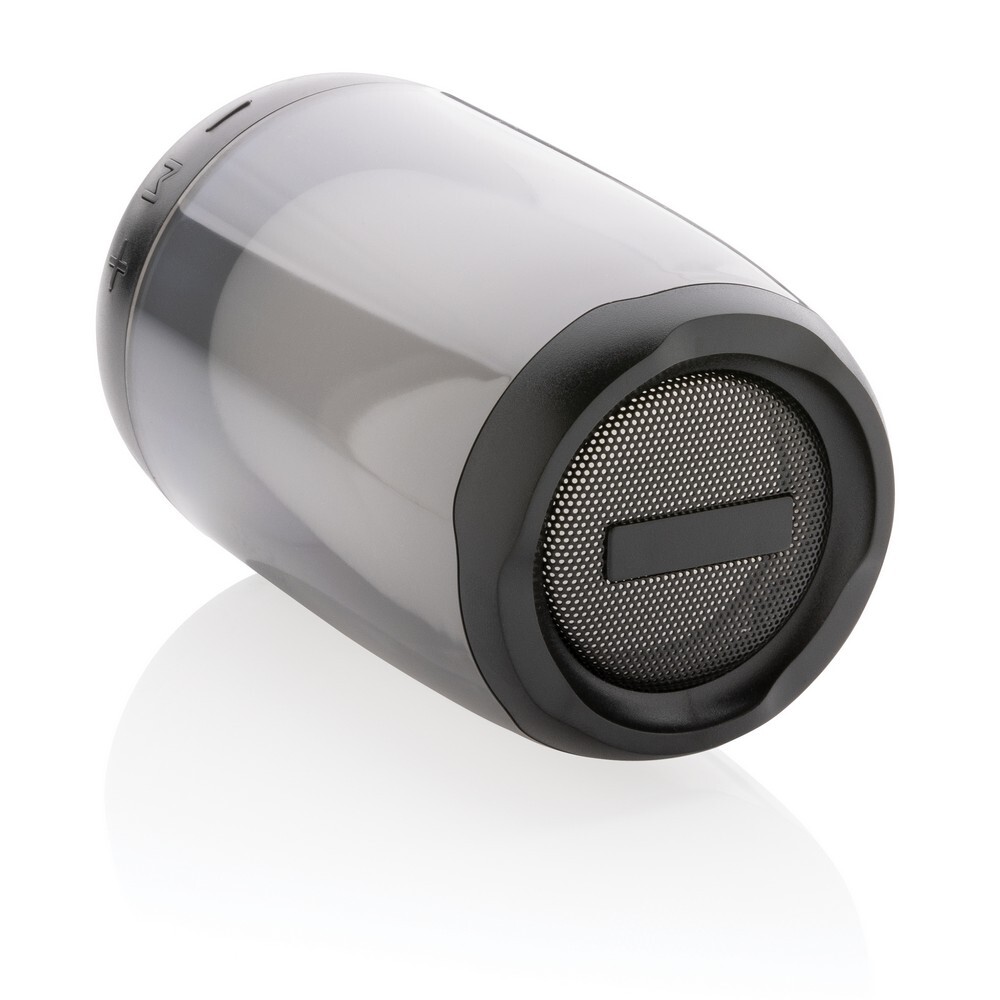 Głośnik bezprzewodowy 5W BT 5.0, wbudowane podświetlenie LED RGB 360 stopni, wbudowany mikrofon, funkcja odbierania połączeń, czytnik kart TF, porty AUX i USB, wbudowany akumulator o pojemności 1200 mAh umożliwia odtwarzanie muzyki do 5 godzin, ponowne ładowanie w 4 godziny, zasięg do 10 m, obudowa wykonana w 100% z ABS z recyklingu z certyfikatem RCS (Recycled Claim Standard), kabel z TPE z recyklingu bez dodatku PVC w komplecie, w pudełku z certyfikatem FSC® mix, nie zawiera PVC