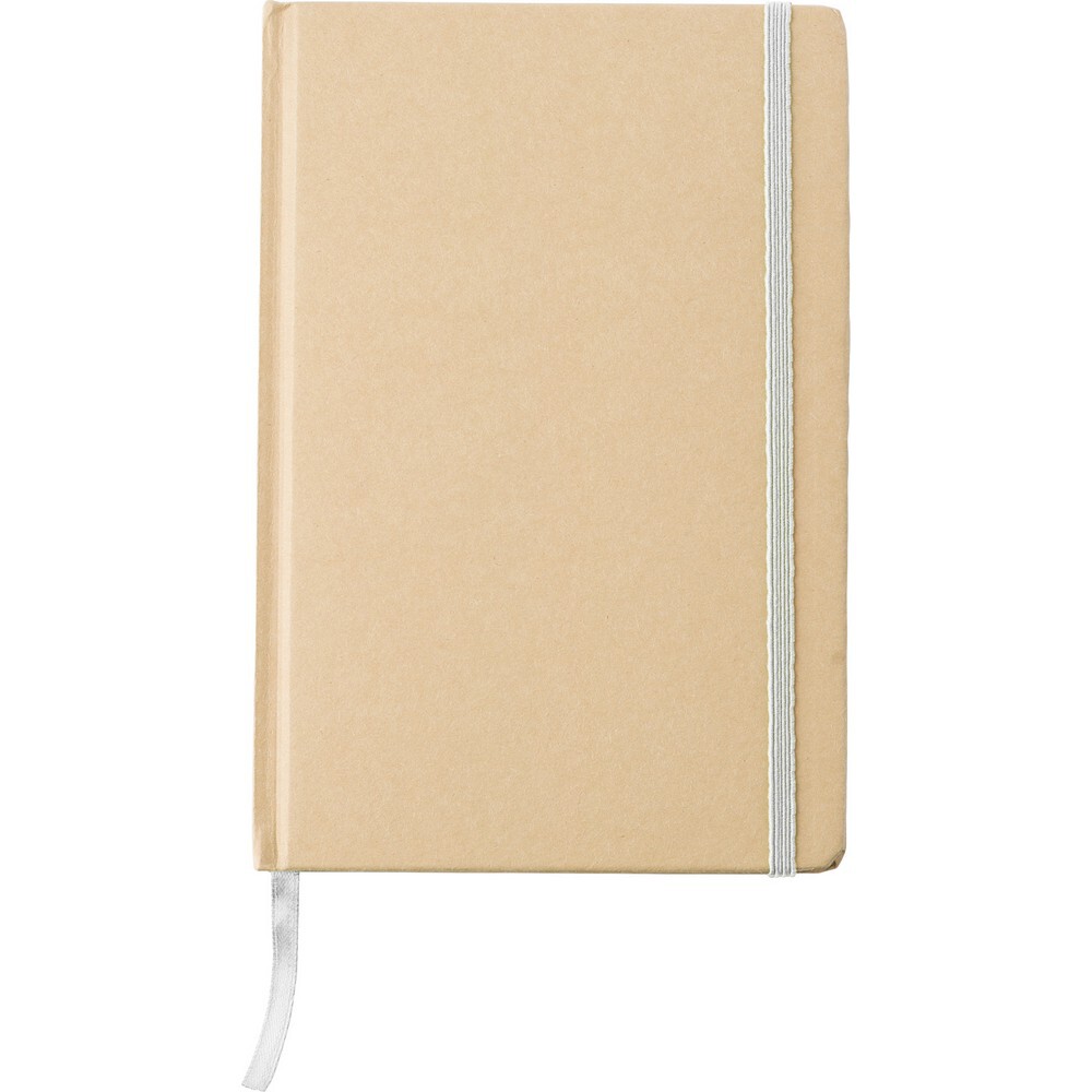 Notatnik (ok. A5, 80 kartek w linie), wykonany z kartonu z recyklingu, tasiemka zakładkowa, elastyczna opaska do zamykania