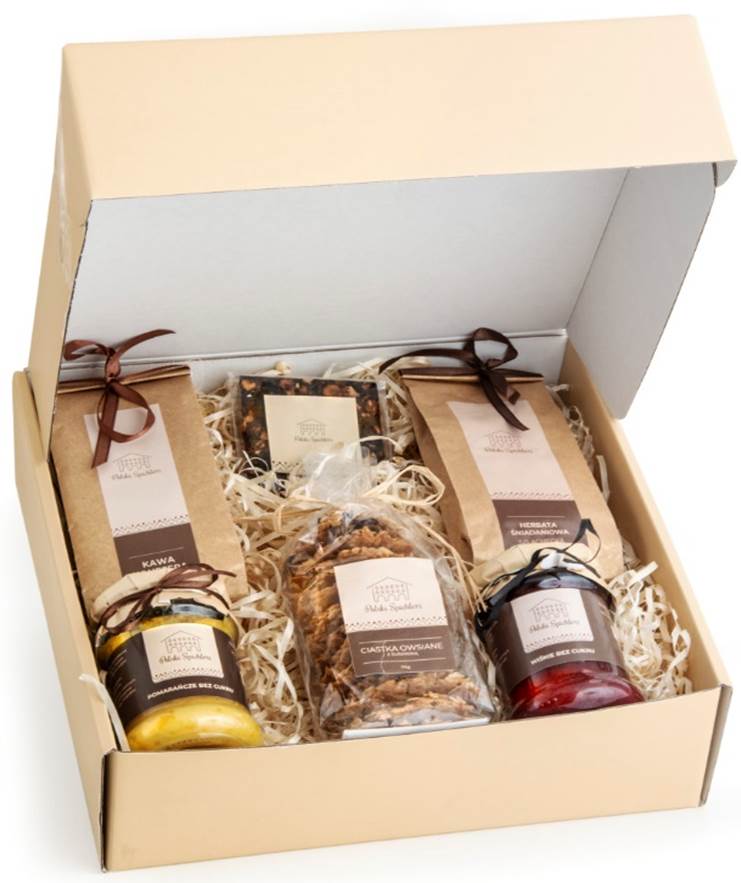 Całość w ręcznie kaszerowanym pudełku z wypełnieniem. Produkty zawinięte w ozdobny pergamin z logo Polski Spichlerz zamknięty stickerem.