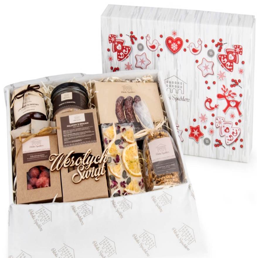Produkty zawinięte w ozdobny pergamin z logo Polski Spichlerz zamknięty stickerem.