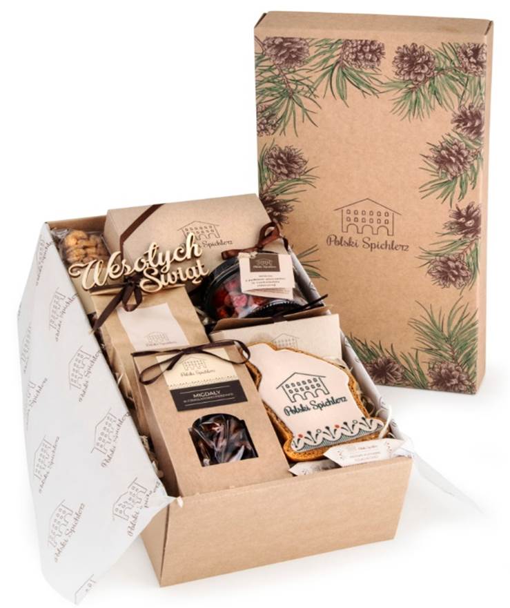 Produkty zawinięte w ozdobny pergamin z logo Polski Spichlerz zamknięty stickerem.