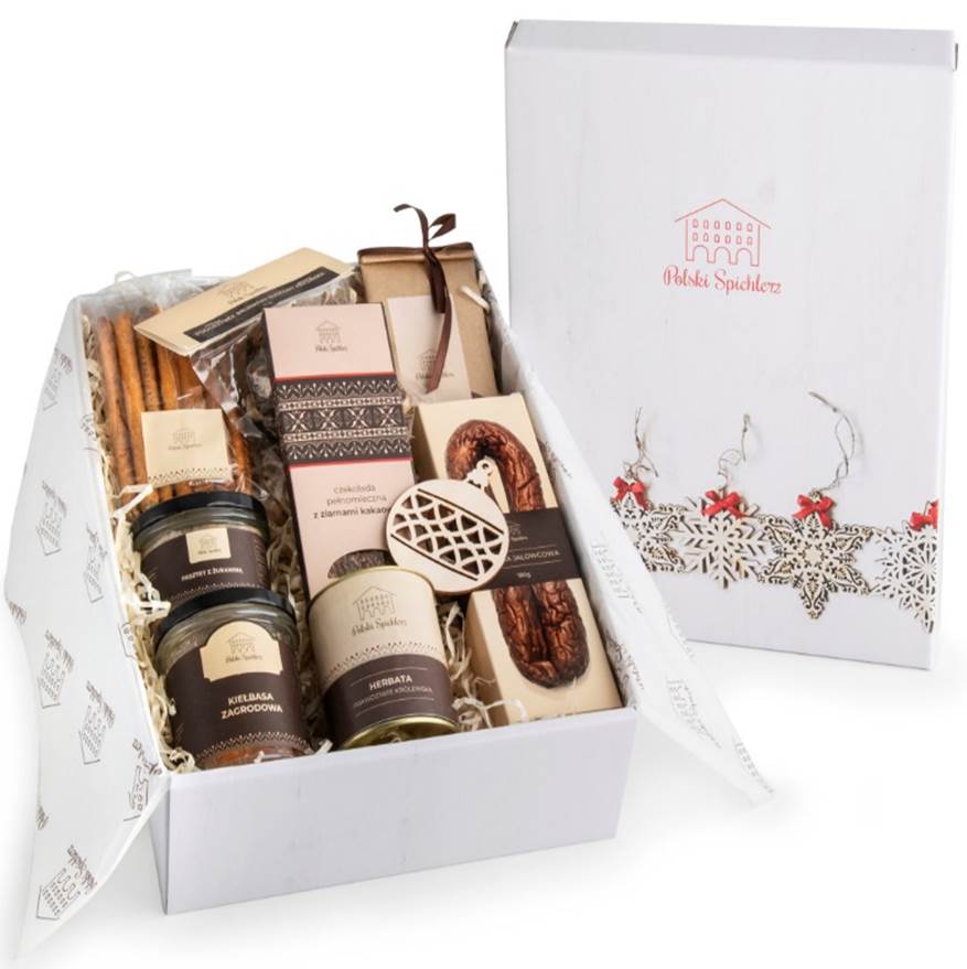 Produkty zawinięte w ozdobny pergamin z logo Polski Spichlerz zamknięty stickerem.