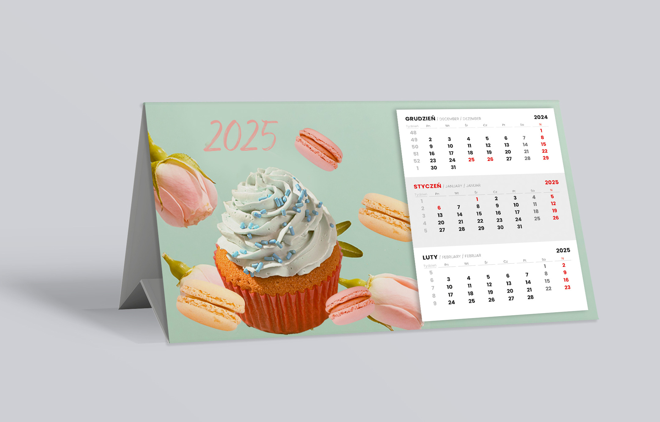 Kalendarz składa się z jednego kawałka kartonu 300 g, klejonego na całej długości podstawy.