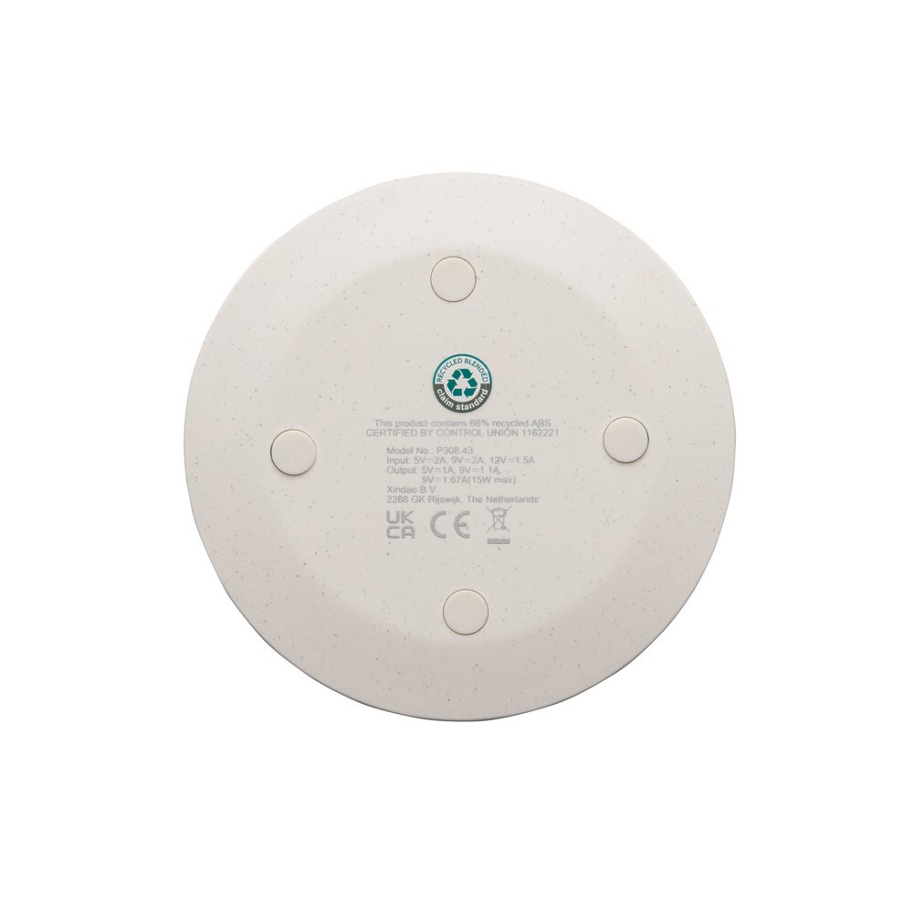 Szybka ładowarka bezprzewodowa 15W, wykonana w 66% z ABS z recyklingu z certyfikatem RCS, zawartość materiałów z recyklingu obliczona w oparciu o wagę całkowitą produktu, działa z telefonami posiadającymi możliwość ładowania indukcyjnego, wejście USB typu C 5V/2A, 9V/2A, 12V/1,5A, wyjście bezprzewodowe 5V/1A, 9V/1.1A, 9 V/1,67A 15W, 120 cm kabel USB typu C z TPE z recyklingu w komplecie, w kraftowym pudełku z certyfikatem FSC® mix, nie zawiera PVC