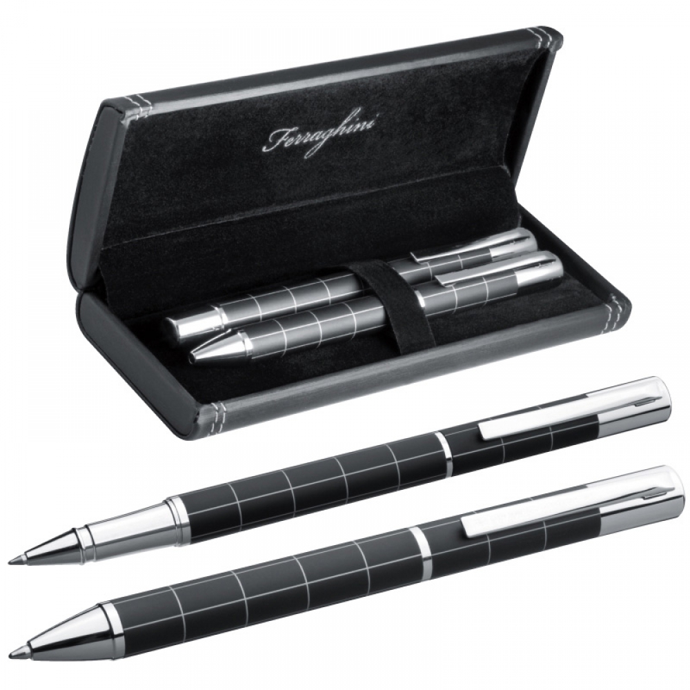 Luksusowy zestaw piśmienny marki Ferraghini z najwyższej jakości metalu, składający się z czarnego pióra kulkowego oraz niebieskiego długopisu. Całość umieszczona w eleganckim etui.