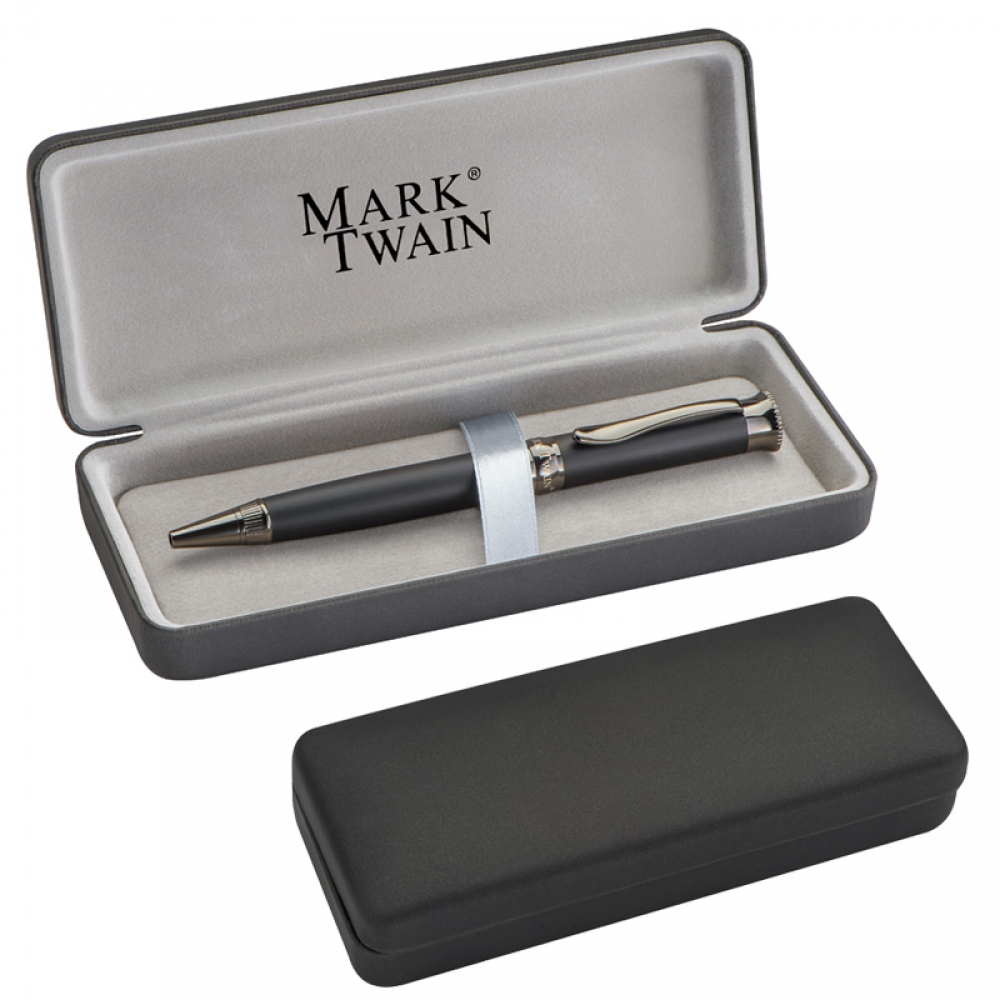 Metalowy długopis marki Mark Twain z chromowanymi elementami i dużym wkładem piszącym na niebiesko. Zapakowany w eleganckie etui. Logotyp można umieścić obok klipsa.