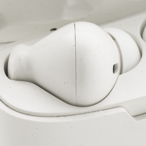 Bezprzewodowe słuchawki duszne, BT 5.0, wykonane z ABS z recyklingu z certyfikatem RCS, całkowita zawartość materiałów z recyklingu obliczona na podstawie wagi całkwitej produktu: 56%, wbudowany mikrofon, funkcja odbierania połączeń stereo, przycisk dotykowy, etui z akumulatorem 300 mAh pełniące funkcję stacji ładującej w komplecie, akumulator słuchawek o pojemności 35 mAh umożliwia odtwarzanie muzyki na średnim poziomie głośności do 3 godzin, ponowne naładowanie za pomocą etui w 1,5 godziny, zasięg do 10 m, 3 rozmiary nakładek dousznych w komplecie, kabel micro USB z TPE bez dodatku PVC w komplecie