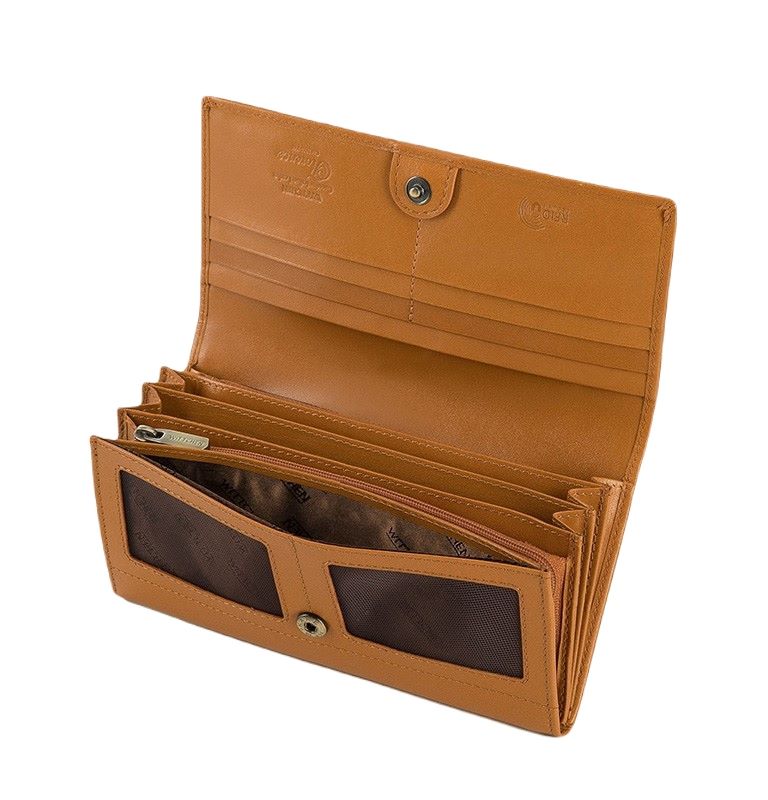 Duży portfel damski wykonany z wytrzymałej skóry cielęcej. Cechuje go prosty krój i funkcjonalne ułożenie kieszonek. Wewnątrz ma wiele otwartych przegródek, miejsca na karty, kieszeń na bilon zapinaną na suwak i dwie kieszenie z siatki, do których schowasz na przykład zdjęcie lub bilet. Dodatkowo ten model jest wyposażony w podszewkę chroniącą karty przed sczytywaniem danych (RFID). Damski portfel skórzany o prostym kroju to ponadczasowy dodatek na lata.