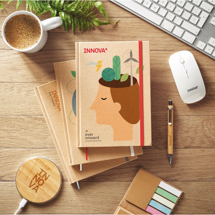 Zeszyt z logo został wykonany z recyklingowego papieru, który jest przyjemny w dotyku i delikatnie zabarwiony co uzmysławia jego ekologiczne pochodzenie. Zeszyt z własnym nadrukiem jest praktyczny i funkcjonalny. Posiada 160 stron w linie, wykonanych z papieru o gramaturze 80 g/m². Zeszyt wyposażony jest w czarną, elastyczną gumkę, która zabezpiecza strony. Okładka zeszytu z własnym nadrukiem wykonana jest z trwałego kartonu z recyklingu, która w dotyku jest gładka i daje uczucie naturalności. Minimalistyczny design i neutralne kolory okładki (czarny, granatowy, czerwony, biały, szary) pozwalają na dopasowanie do osobistego stylu każdego użytkownika. Idealny rozmiar A5 (22x15 cm), łatwo mieści się w torbie czy plecaku, a jednocześnie oferuje wystarczająco dużo miejsca na notatki.