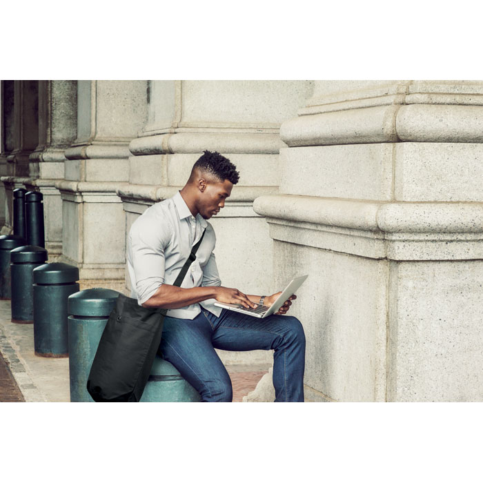 Torba z płótna z długim, regulowanym paskiem na ramię i dużą przednią kieszenią z zamknięciem na zatrzask. Zawiera wewnętrzną kieszeń. 270 gr/m².