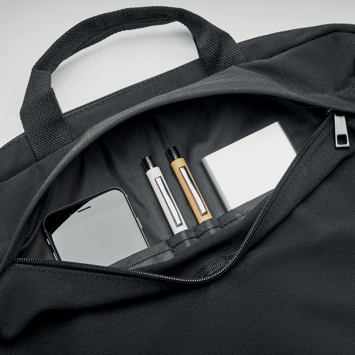 Torba na komputer 340 gr/m² z płótna canvas. Wyściełany, odpinany i regulowany pasek na ramię. Z tyłu pasek na rączkę walizki.