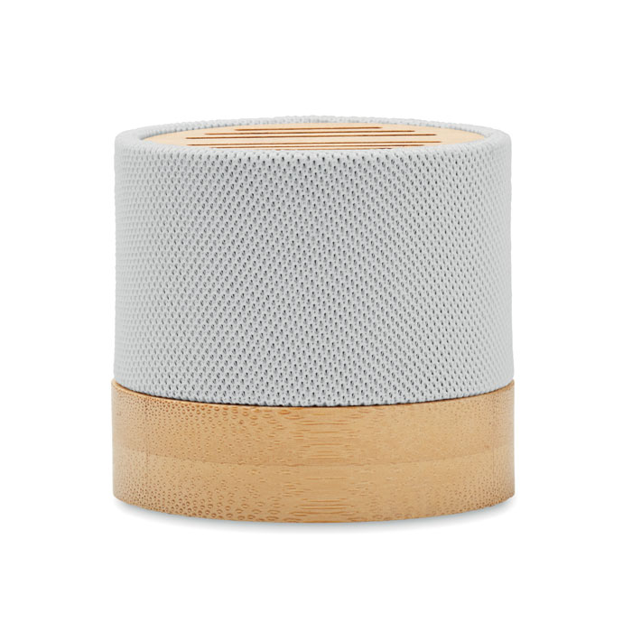 Głośnik bezprzewodowy 5.0 z RPET z bambusowym elementem. Sygnalizacja LED. 1 Akumulator Li-ION 400 mAh. Zawiera port kart SD oraz kabel AUX/USB. Wyjście: 3W, 3 Ohm i 5V. Czas odtwarzania ok. 3h.