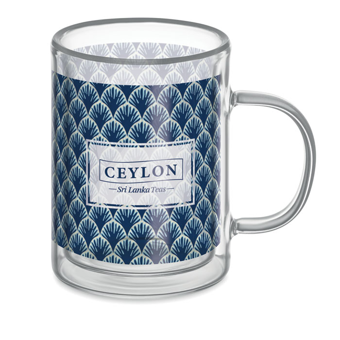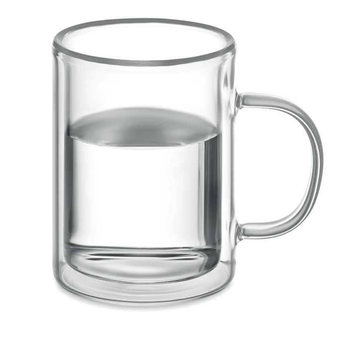 Szklany kubek, szklanka o podwójnych ściankach i pojemności 225 ml, ze specjalną powłoką do sublimacji.