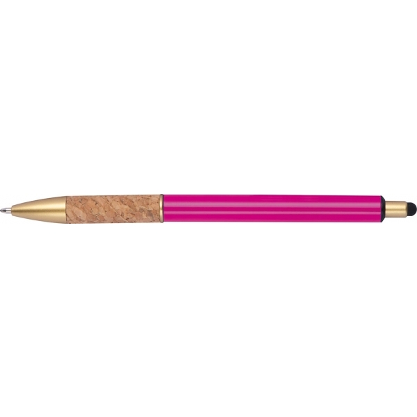 Metalowy długopis z złotymi elementami i korkową strefą uchwytu to elegancka propozycja, która łączy nowoczesny design z naturalnymi akcentami. Wyposażony w gumkę do obsługi ekranów dotykowych oraz wkład piszący na niebiesko, zapewnia wygodę i płynność pisania, a także umożliwia wygodne korzystanie z urządzeń mobilnych.Idealny do biura, na prezent czy do codziennych notatek, ten długopis łączy estetykę, funkcjonalność i komfort, stając się niezawodnym narzędziem w każdej sytuacji.