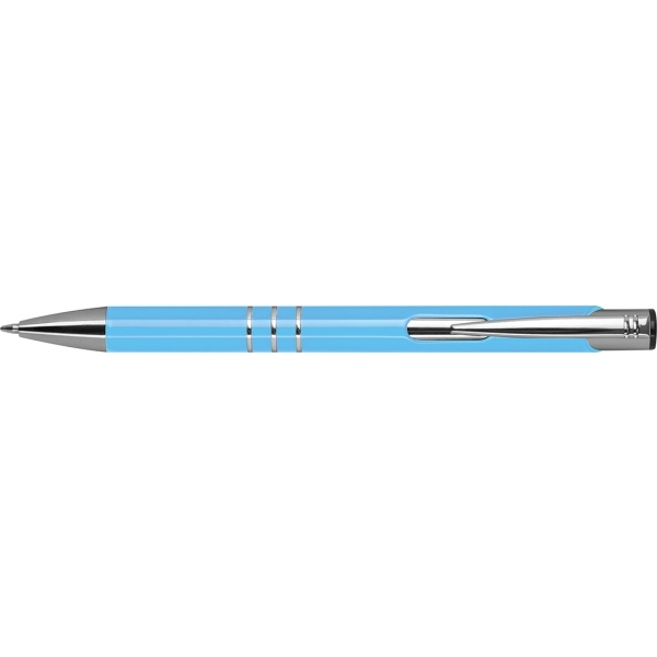 Klasyczny metalowy długopis, popularny wybór jako gadżet reklamowy na rozdanie lub gadżet z logo promujący markę. Wykonany z aluminium, charakteryzuje się srebrnym wykończeniem smukłego klipsu oraz trzema ringami, które elegancko dekorują jego korpus. Długopis sprawdzi się zarówno w biurze, jak i podczas spotkań biznesowych. Mechanizm na "klik" zapewnia szybkie i łatwe wysuwanie wkładu, co czyni go wygodnym i praktycznym narzędziem do codziennego użytku. Wyposażony w duży, niebieski wkład, długopis gwarantuje długotrwałe pisanie bez potrzeby częstego wymieniania wkładu. Ten długopis to doskonały wybór dla osób, które cenią sobie sprawdzone gadżety w atrakcyjnej cenie.