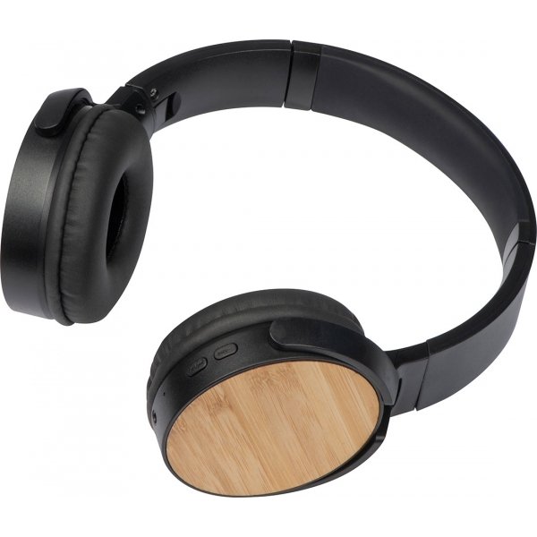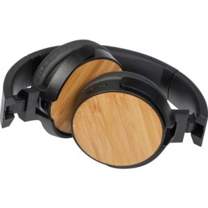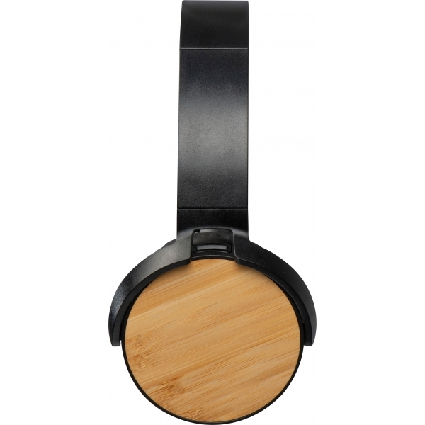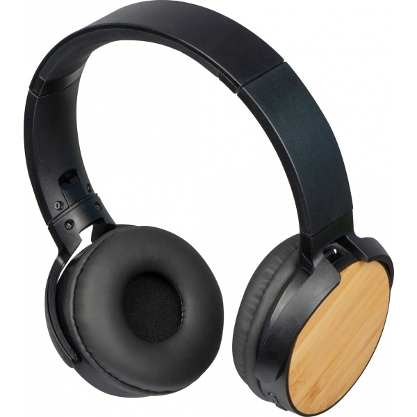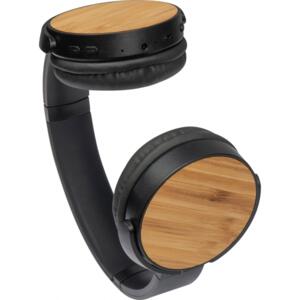 Składane słuchawki bezprzewodowe z plastiku z bambusowymi wstawkami na nausznikach. Słuchawki mają wbudowany akumulator o pojemności 300 mAh i mikrofon umożliwiający prowadzenie rozmów telefonicznych. Kabel do ładowania jest dołączony do zestawu.
