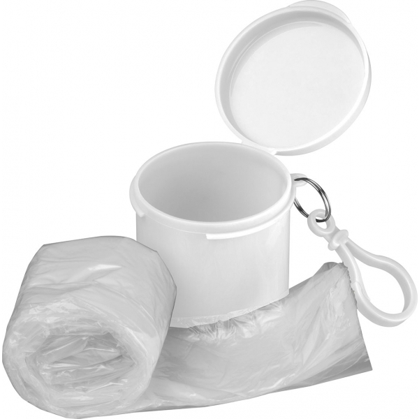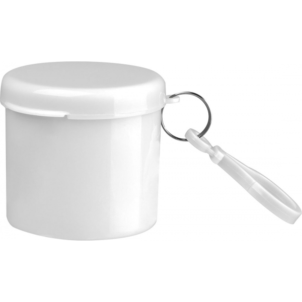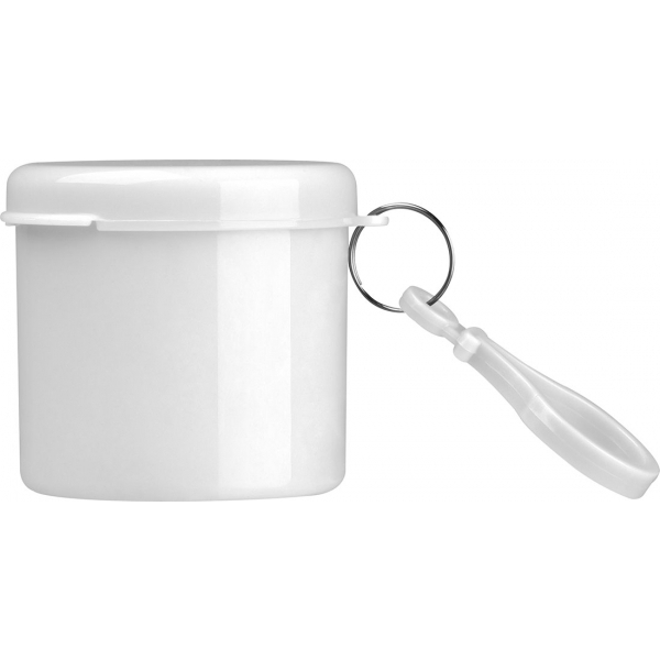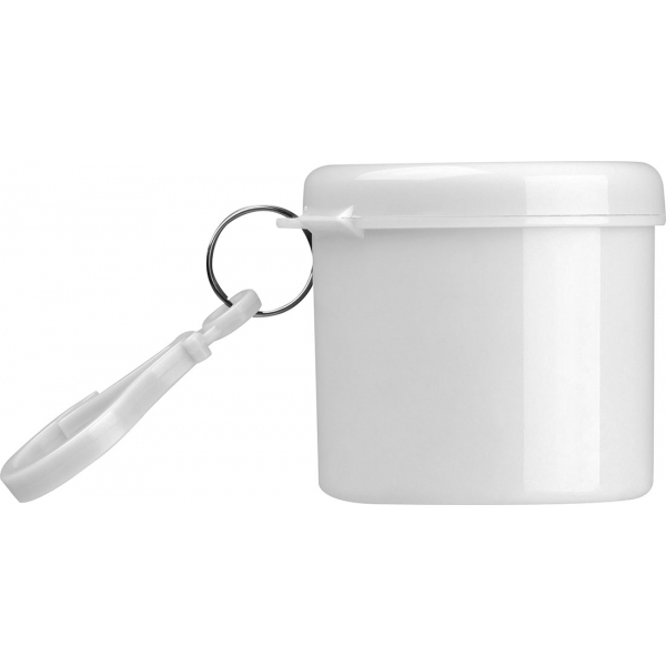 Przezroczysty płaszcz przeciwdeszczowy umieszony w plastikowym etui z karabińczykiem.