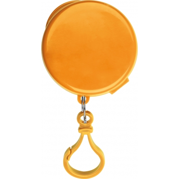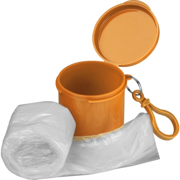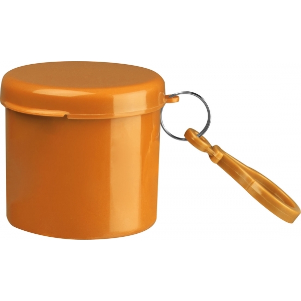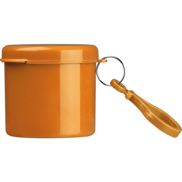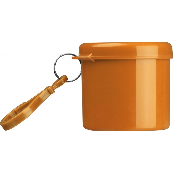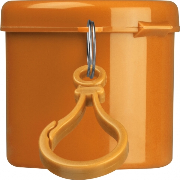 Przezroczysty płaszcz przeciwdeszczowy umieszony w plastikowym etui z karabińczykiem.