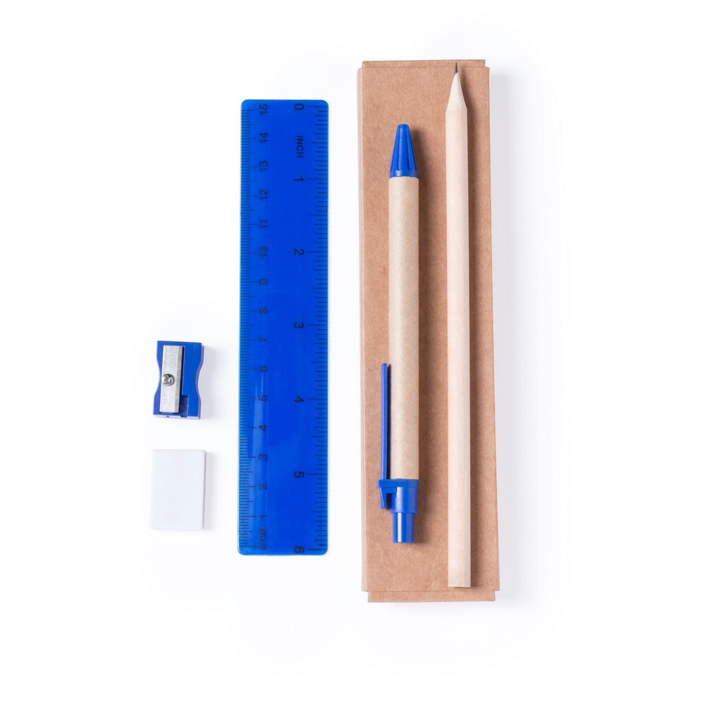 Zestaw szkolny w pudełku, ołówek, długopis z trzonem z kartonu z recyklingu, gumka, temperówka i linijka