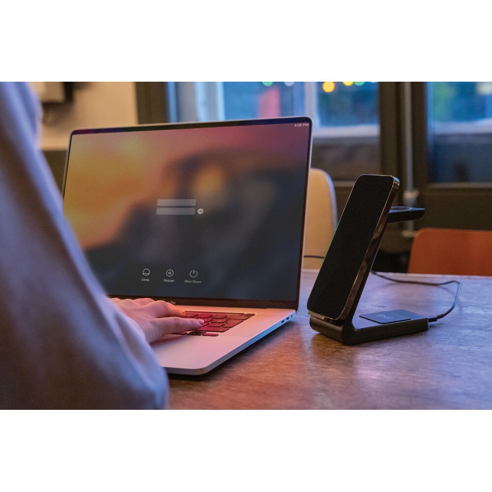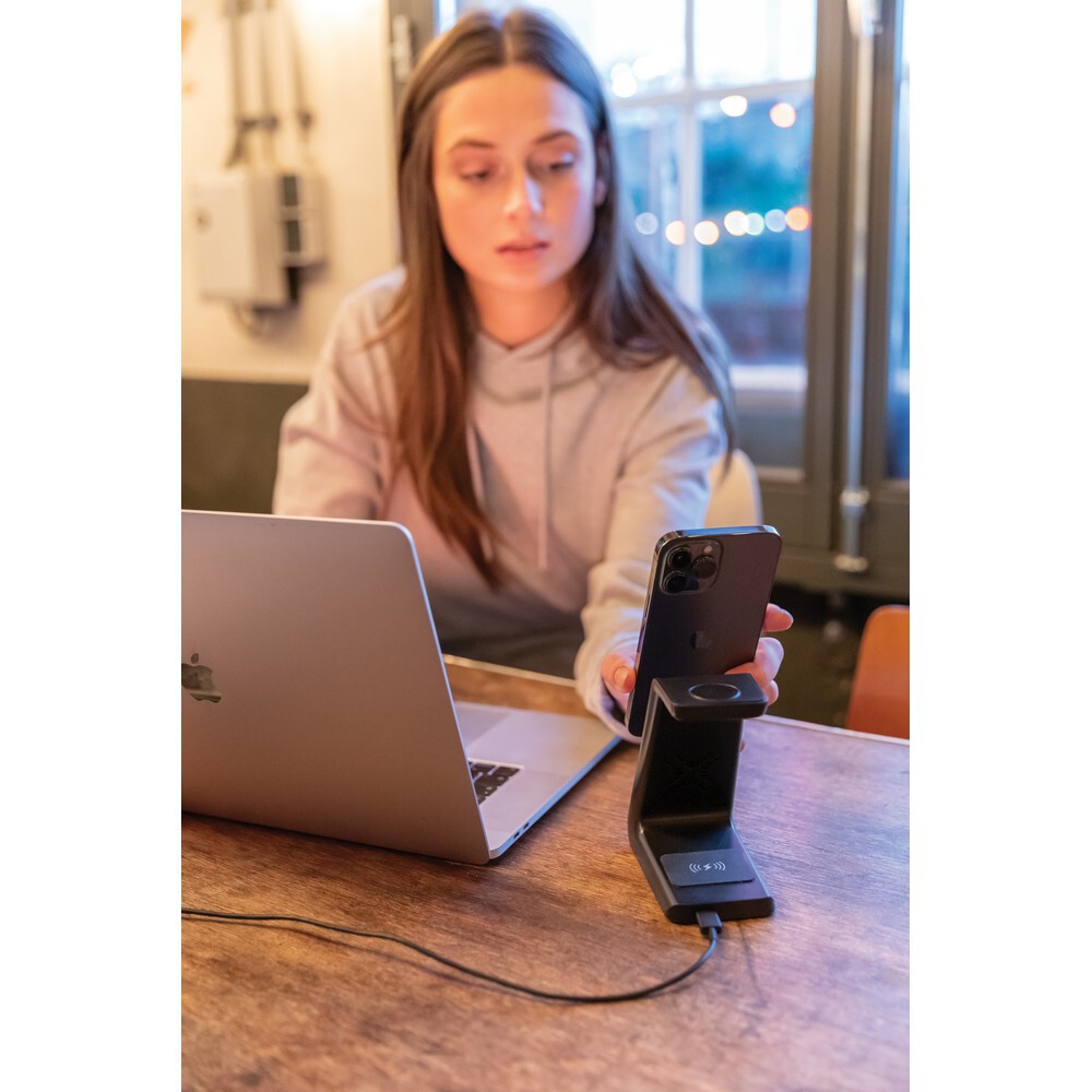 Bezprzewodowa podstawka ładująca 15W wykonana z ABS z recyklingu, zawartość materiałów z recyklingu obliczona na podstawie wagi całkowitej przedmiotu: 65%, bezprzewodowa ładowarka dual coil 15, bezprzewodowa ładowarka 5W z tyłu i ładowarka 3W, 120 cm kabel USB typu C z TPE z recyklingu z certyfikatem RCS w komplecie, opakowanie o zmniejszonej zawartości plastiku, produkt nie zawiera PVC
