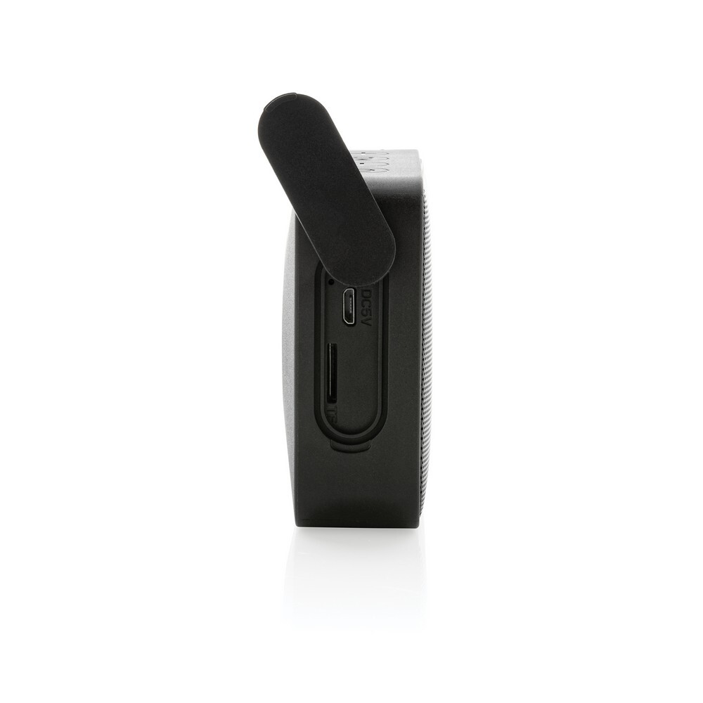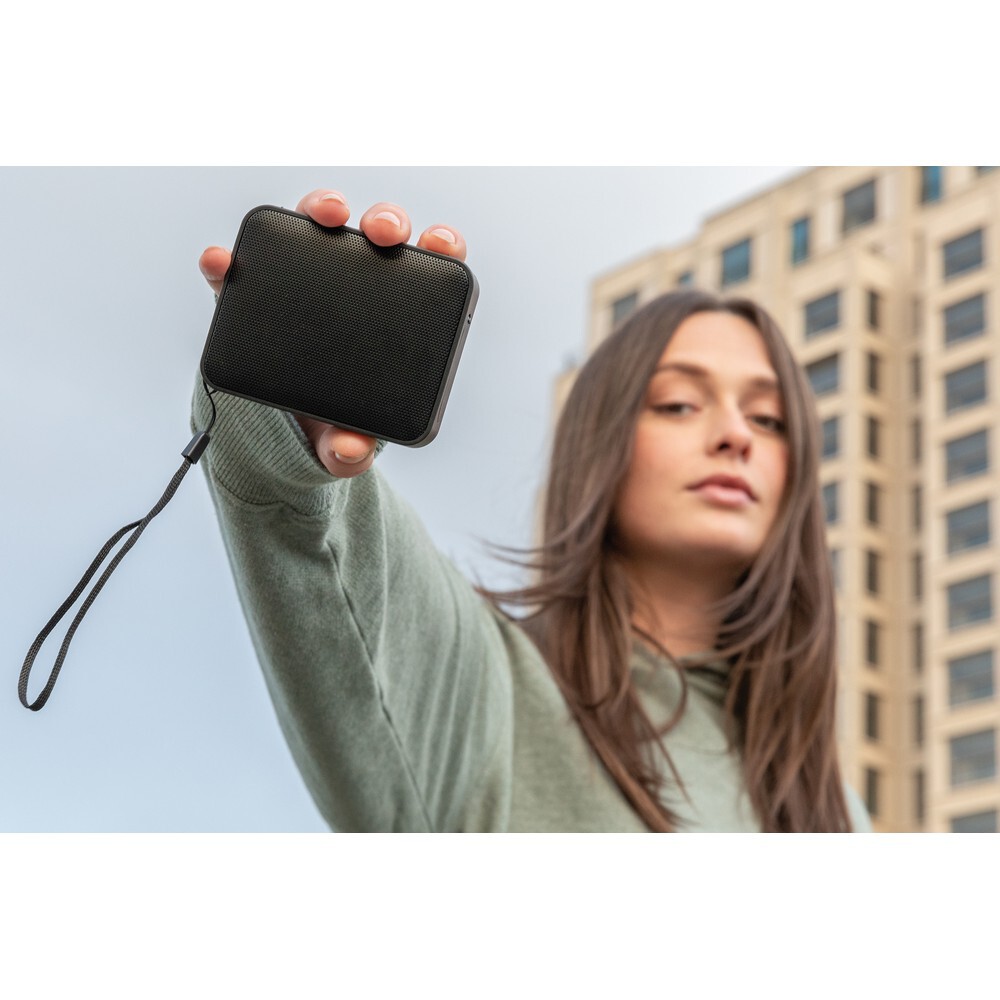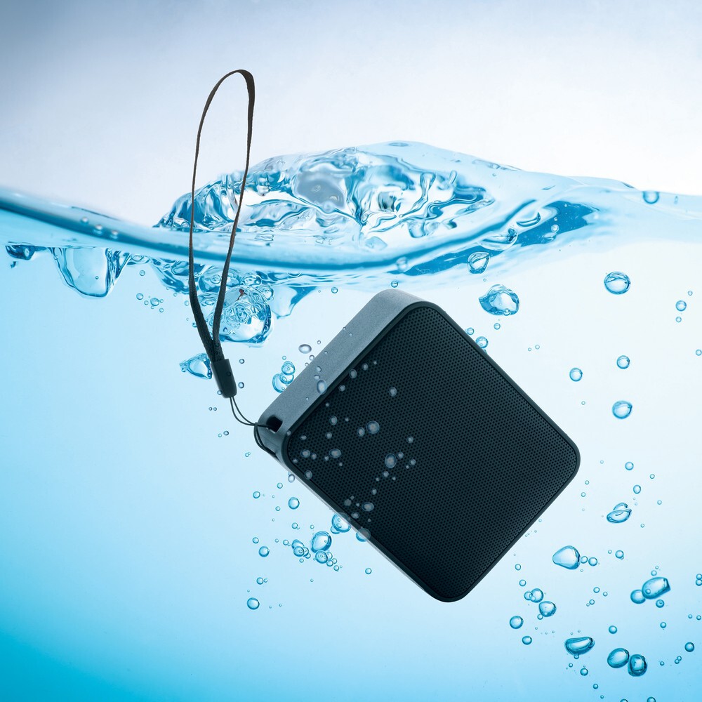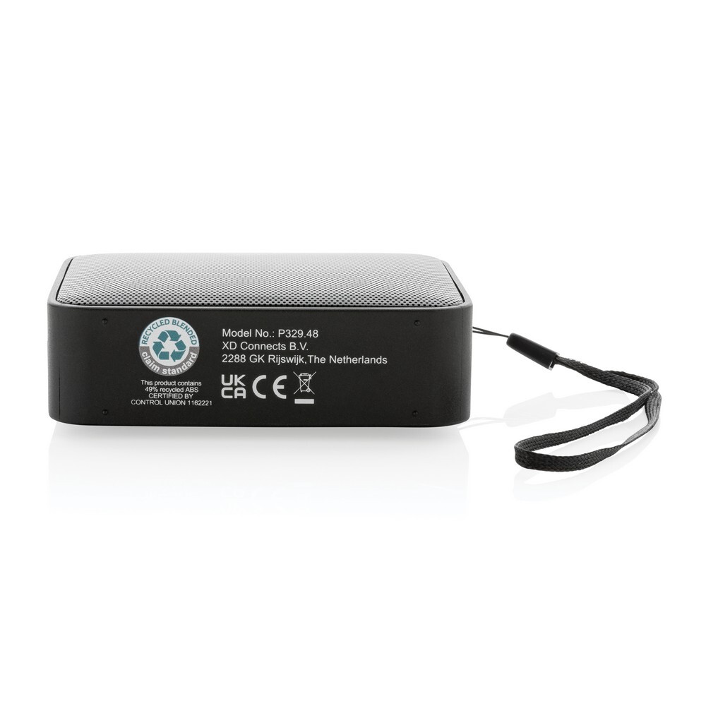Głośnik bezprzewodowy 3W, BT 5.1, wykonany z ABS z recyklingu, posiada certyfikat RCS (Recycled Claim Standard), całkowita zawartość materiału z recyklingu obliczona w oparciu o wagę całkowitą przedmiotu: 49%, odtwarzanie muzyki do 6 godzin, zasięg do 10 m, wodoodporność IPX7, kabel USB typu C wykonany z TPE z recyklingu w komplecie, nie zawiera PVC