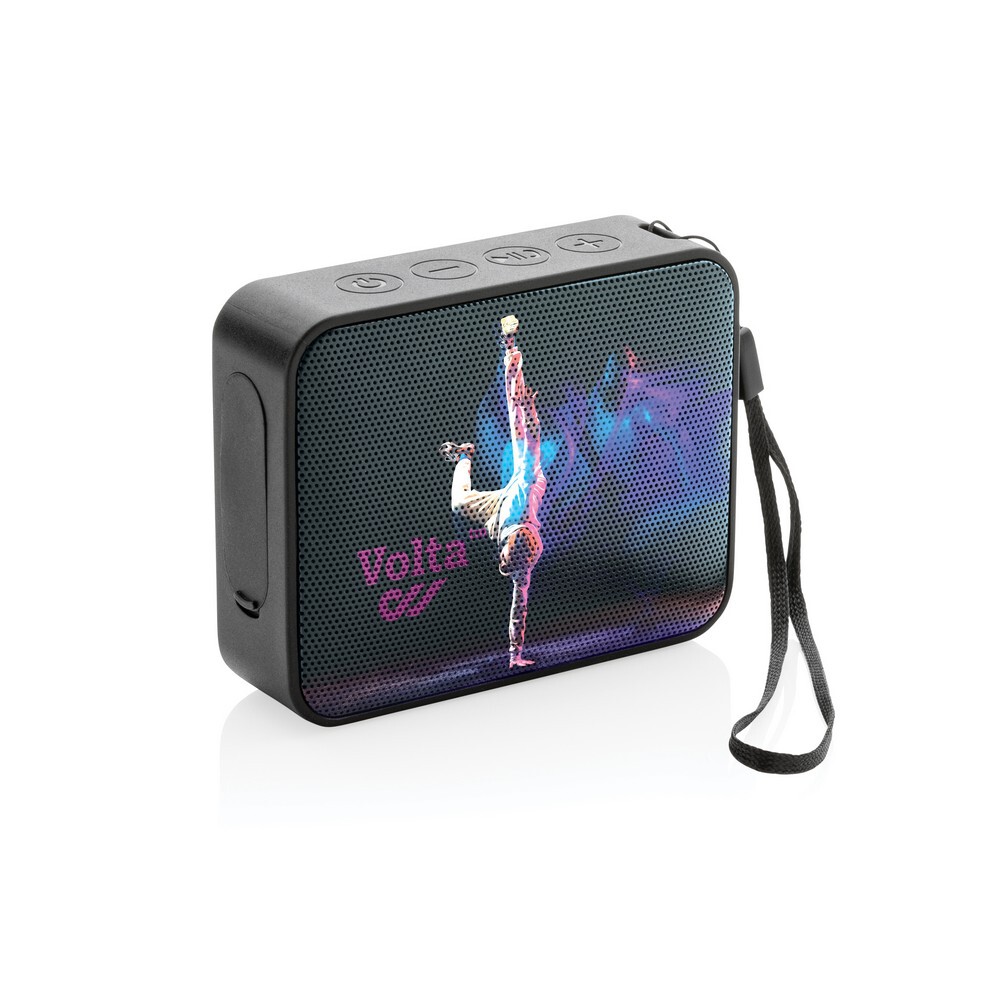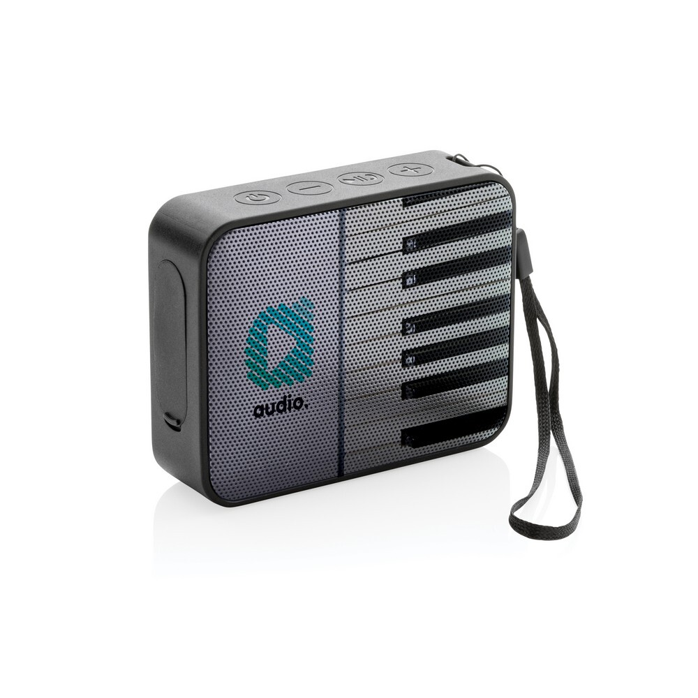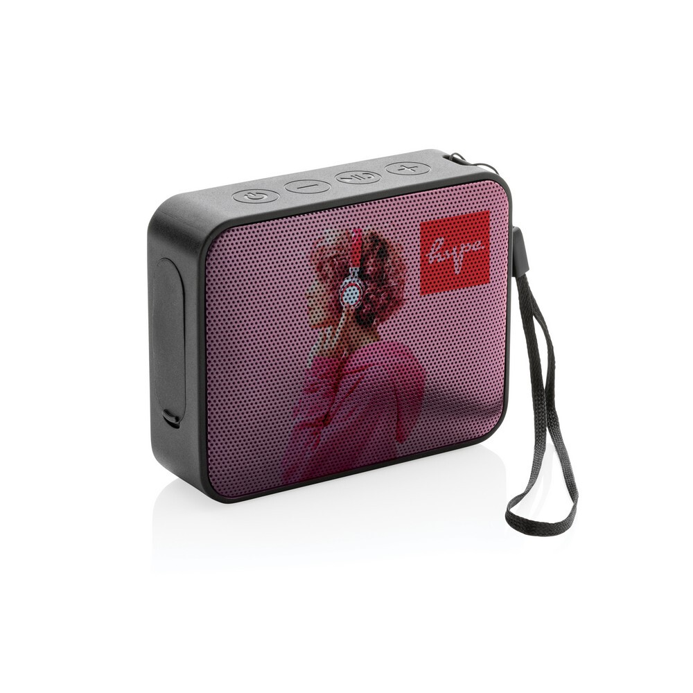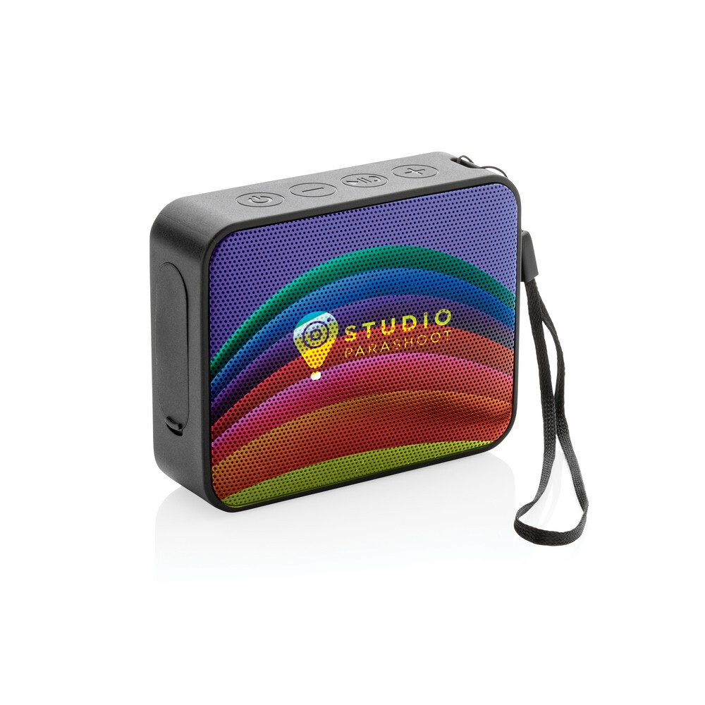 Głośnik bezprzewodowy 3W, BT 5.1, wykonany z ABS z recyklingu, posiada certyfikat RCS (Recycled Claim Standard), całkowita zawartość materiału z recyklingu obliczona w oparciu o wagę całkowitą przedmiotu: 49%, odtwarzanie muzyki do 6 godzin, zasięg do 10 m, wodoodporność IPX7, kabel USB typu C wykonany z TPE z recyklingu w komplecie, nie zawiera PVC