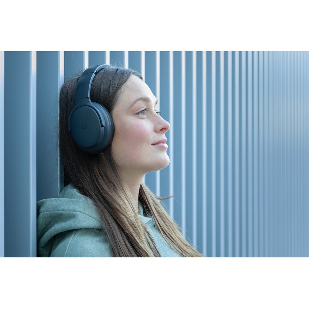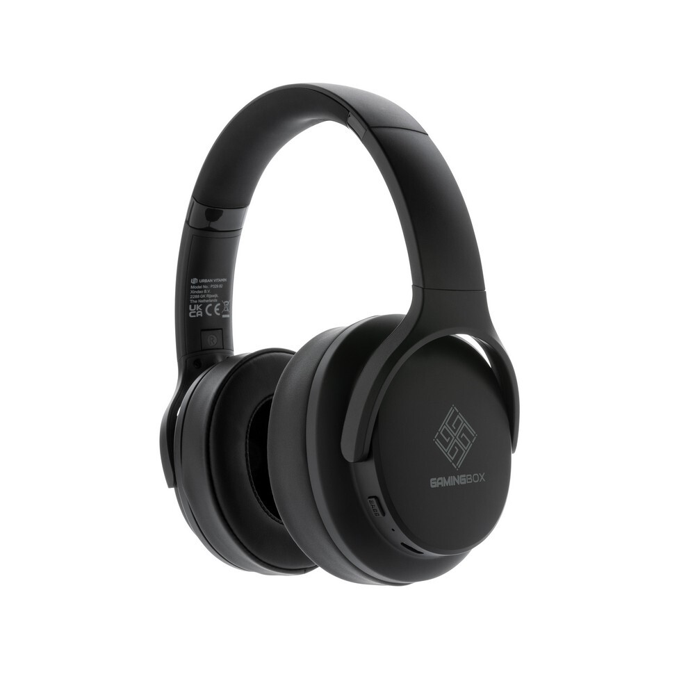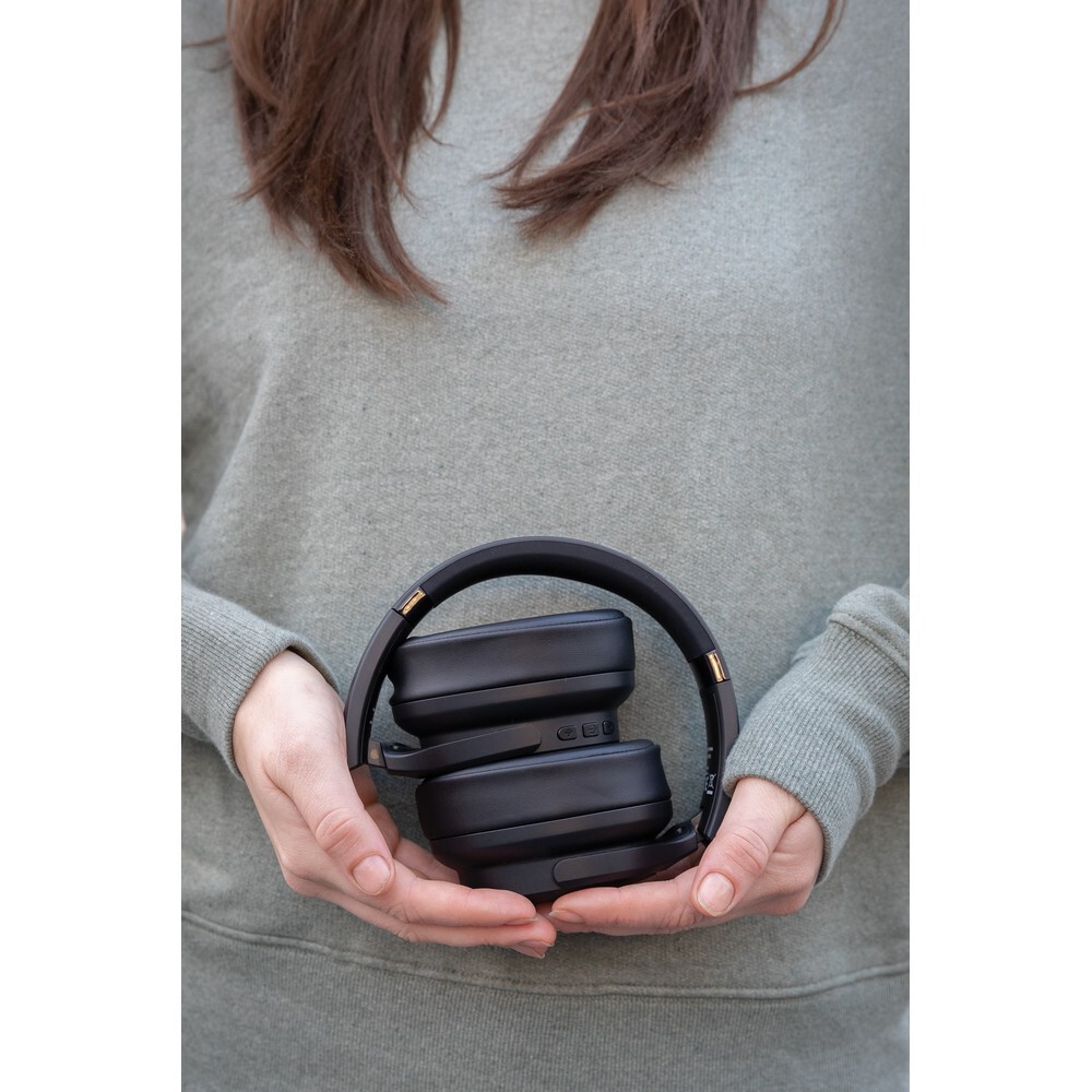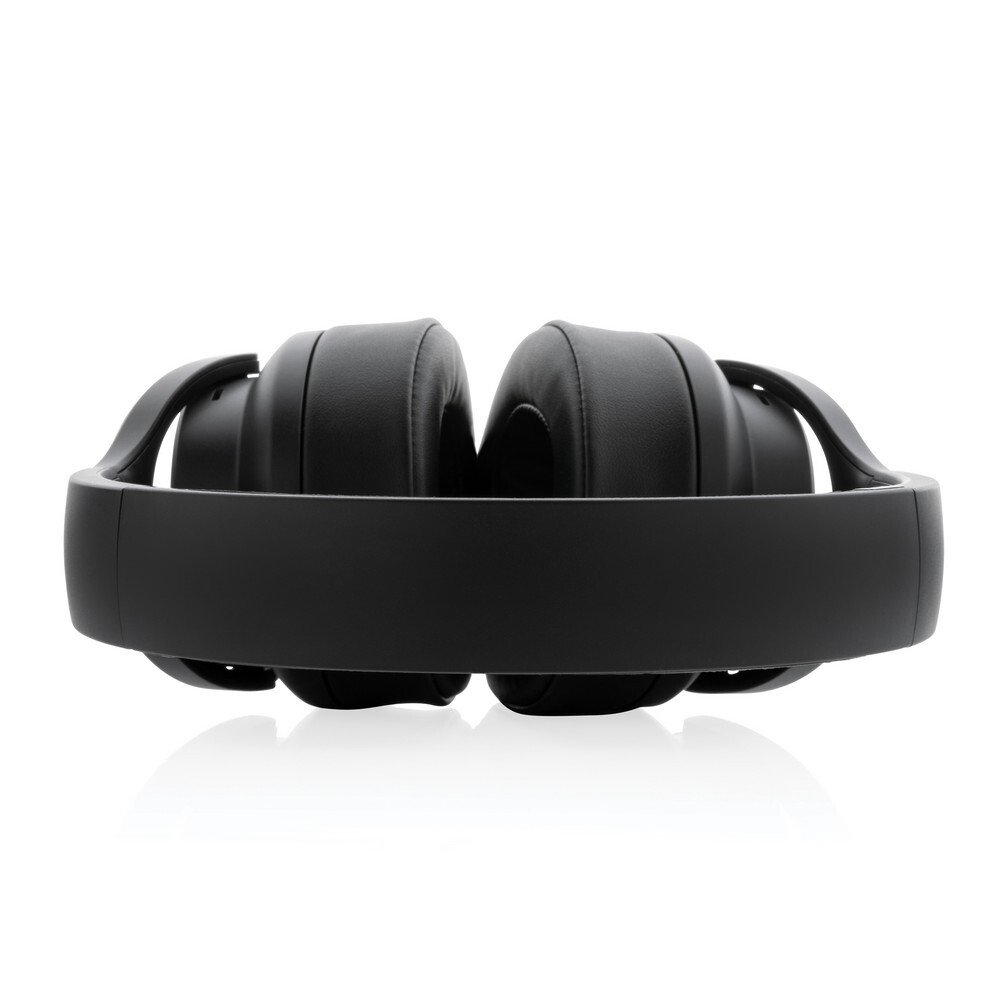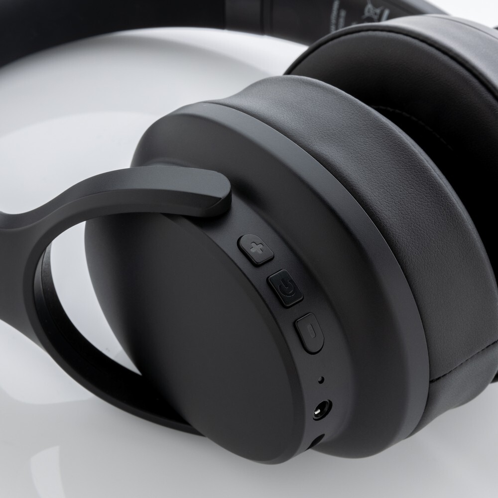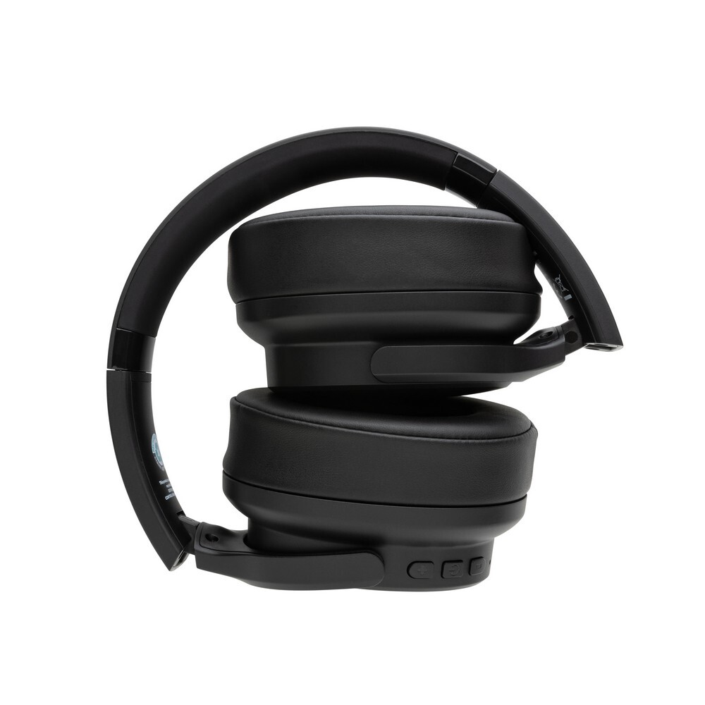 Bezprzewodowe słuchawki nauszne, składane, wykonane z ABS z recyklingu z certyfikatem RCS, całkowita zawartość materiałów z recyklingu obliczona na podstawie wagi całkowitej przedmiotu: 63%, wbudowany mikrofon, funkcja odbierania połączeń, do 48 godzin odtwarzania na jednym ładowaniu, nie zawiera PVC, opakowanie o zmniejszonej zawartości plastiku, nie zawiera PVC