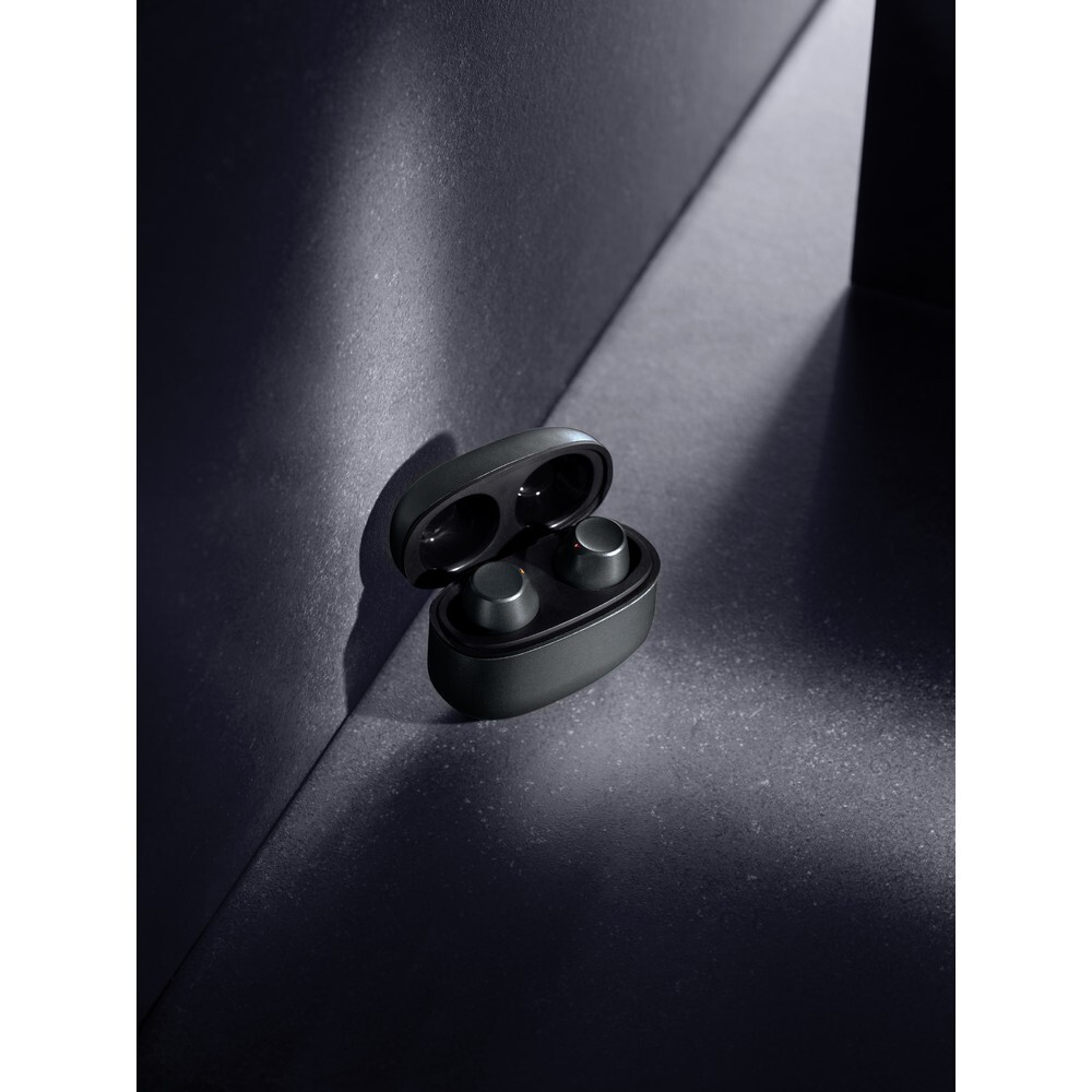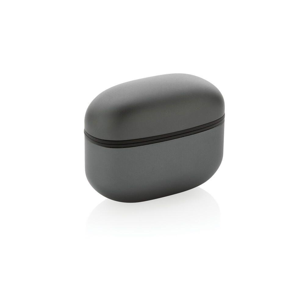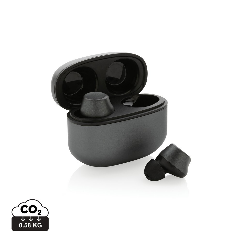 Bezprzewodowe słuchawki douszne BT 5.3, wykonane z aluminium z recyklingu i ABS, zawartość materiałów z recyklingu obliczona na podstawie wagi całkowitej przedmiotu: 64%, etui 300 mAh pełniące funkcję stacji ładującej w komplecie, akumulator słuchawek 40 mAh umożliwia odtwarzanie muzyki do 5 godzin, ponowne naładowanie za pomocą etui w 1.5 godziny, zasięg do 10 metrów, w pudełku z certyfikatem FSC® mix, kabel USB typu C wykonany z alumunium z recyklingu, TPE oraz PET w komplecie, nie zawiera PVC