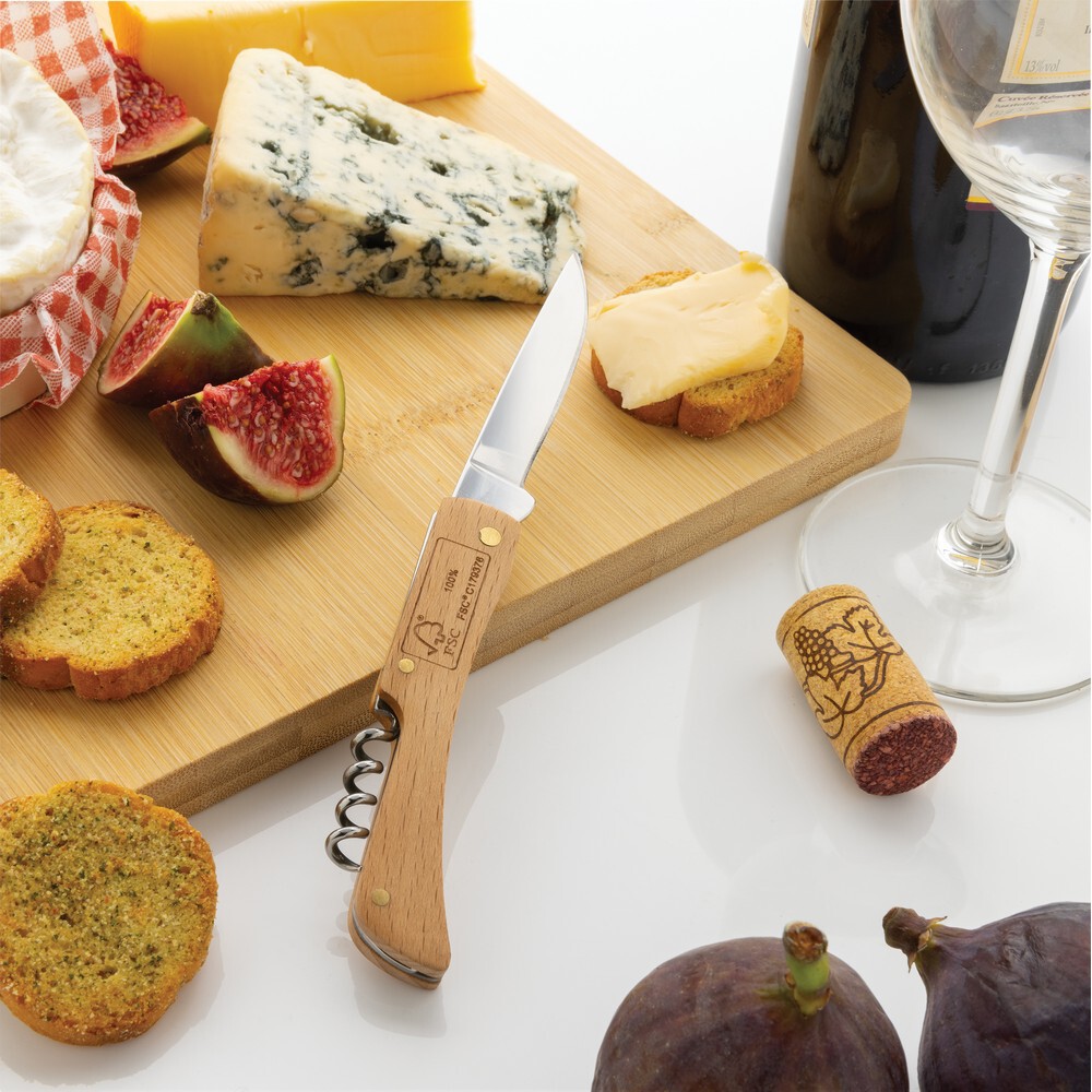 Nóż składany, scyzoryk, ostrze ze stali nierdzewnej, drewniana rękojeść, otwieracz do butelek, w pudełku upominkowym z papieru kraftowego certyfikatem FSC® mix