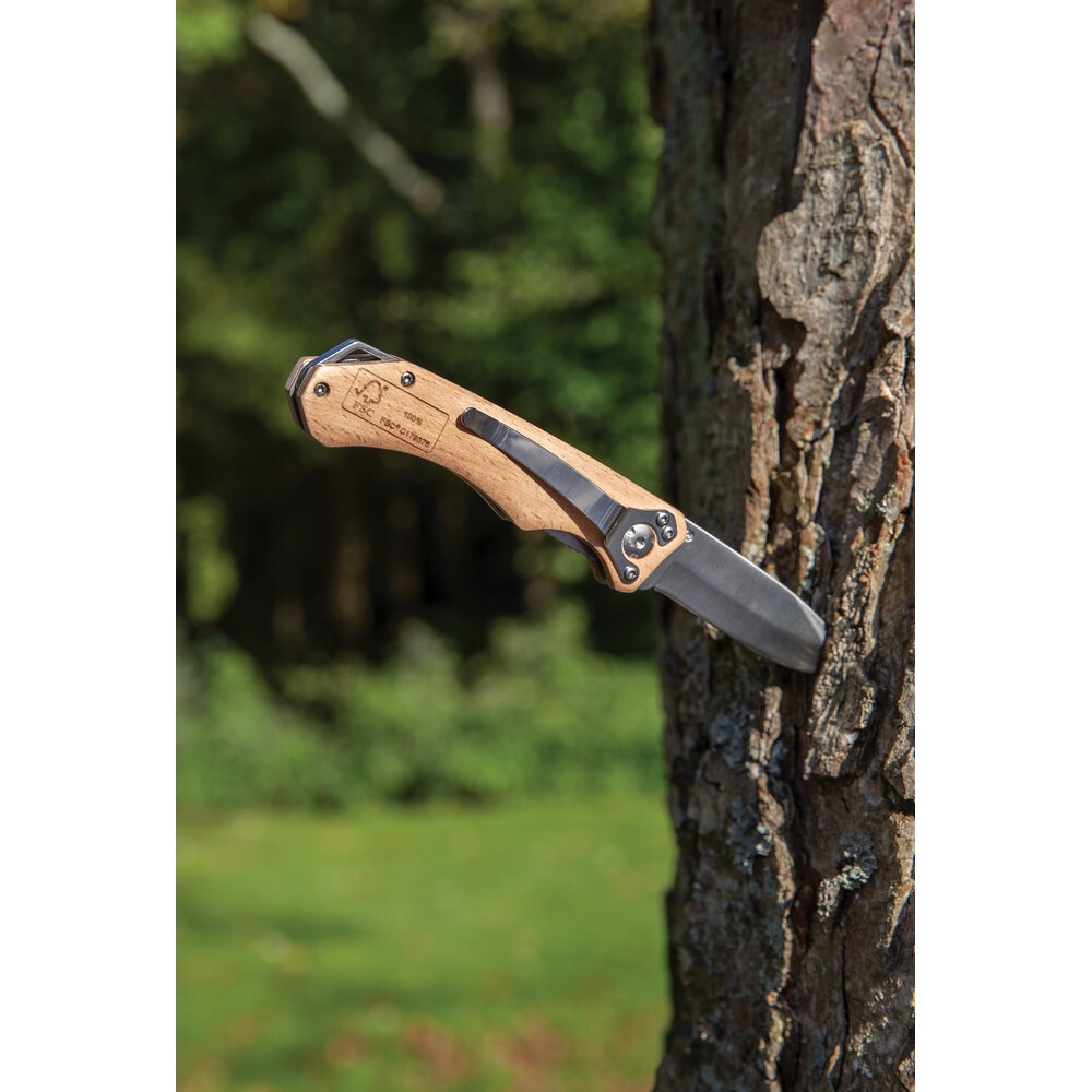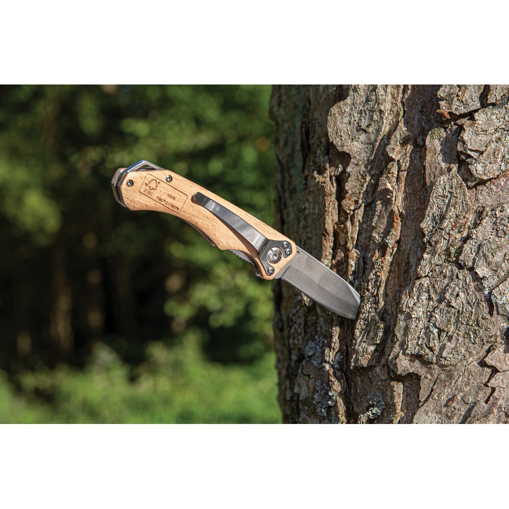 Nóż składany, scyzoryk, ostrze ze stali nierdzewnej z zabezpieczeniem, drewniana rękojeść, klip do paska, w pudełku upominkowym z papieru kraftowego certyfikatem FSC® mix
