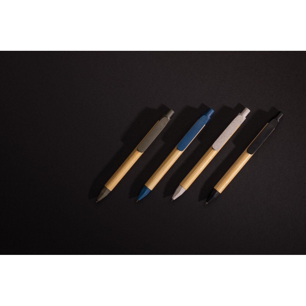 Długopis, wykonany z papieru z recyklingu, bambusowy wzór na trzonie, klip ze słomy pszenicznej, niemiecki wkład Dokumental® w kolorze niebieskim w komplecie, długość pisania ok. 1000 m, kulka TC zapewnia wygodne pisanie