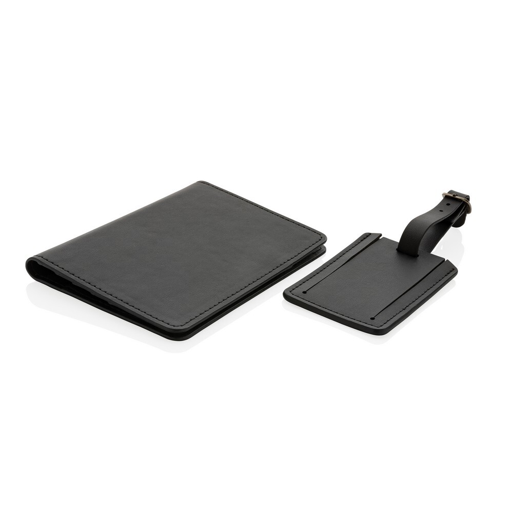 Zestaw podróżny, zawieszka bagażowa, etui na paszport, wiele kieszonek wewnątrz, wykonane z PU z recyklingu z certyfikatem GRS, całkowita zawartość materiałów z recyklingu obliczona na podstawie wagi całkowitej przedmiotu: 70%, w pudełku upominkowym z certyfikatem FSC®