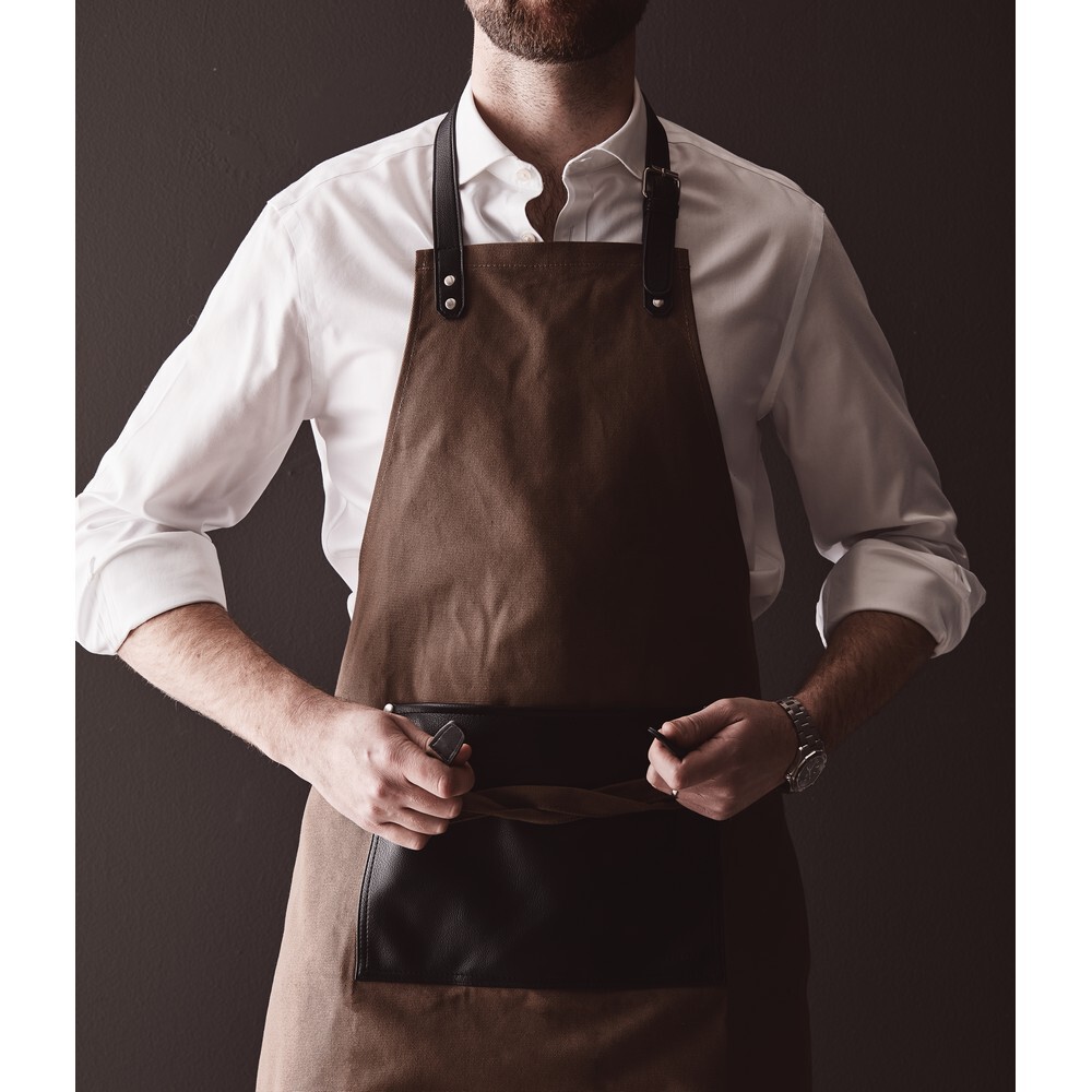 Fartuch kuchenny, wykonany z bawełny, detale ze skóry wegańskiej, kieszeń z przodu, regulowany pasek