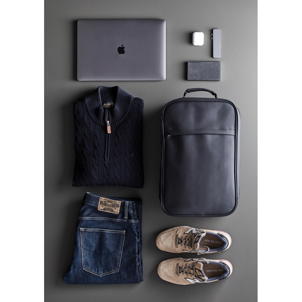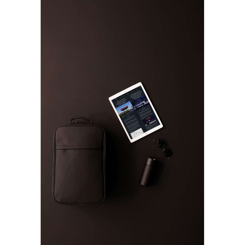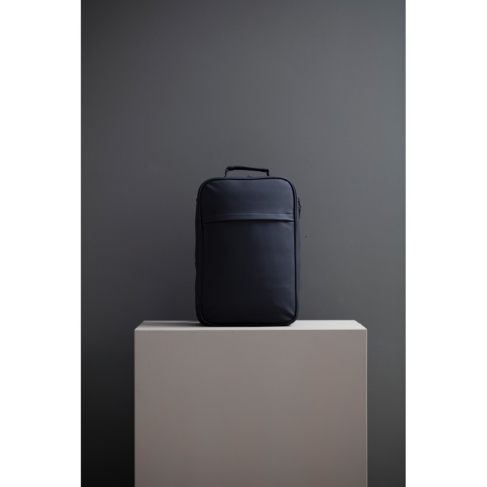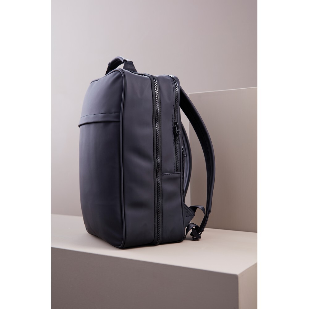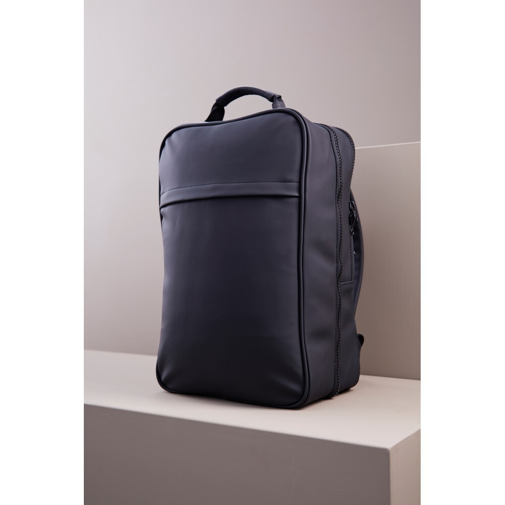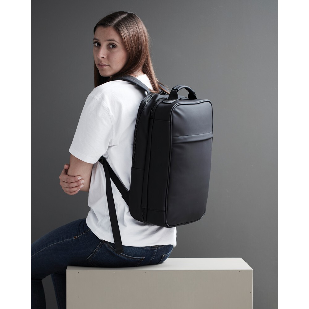 Plecak, wykonany ze skóry wegańskiej, przegroda na laptopa wewnątrz, główna przegroda z mniejszymi kieszeniami wewnątrz, ukryta kieszeń z tyłu, regulowane paski na ramiona