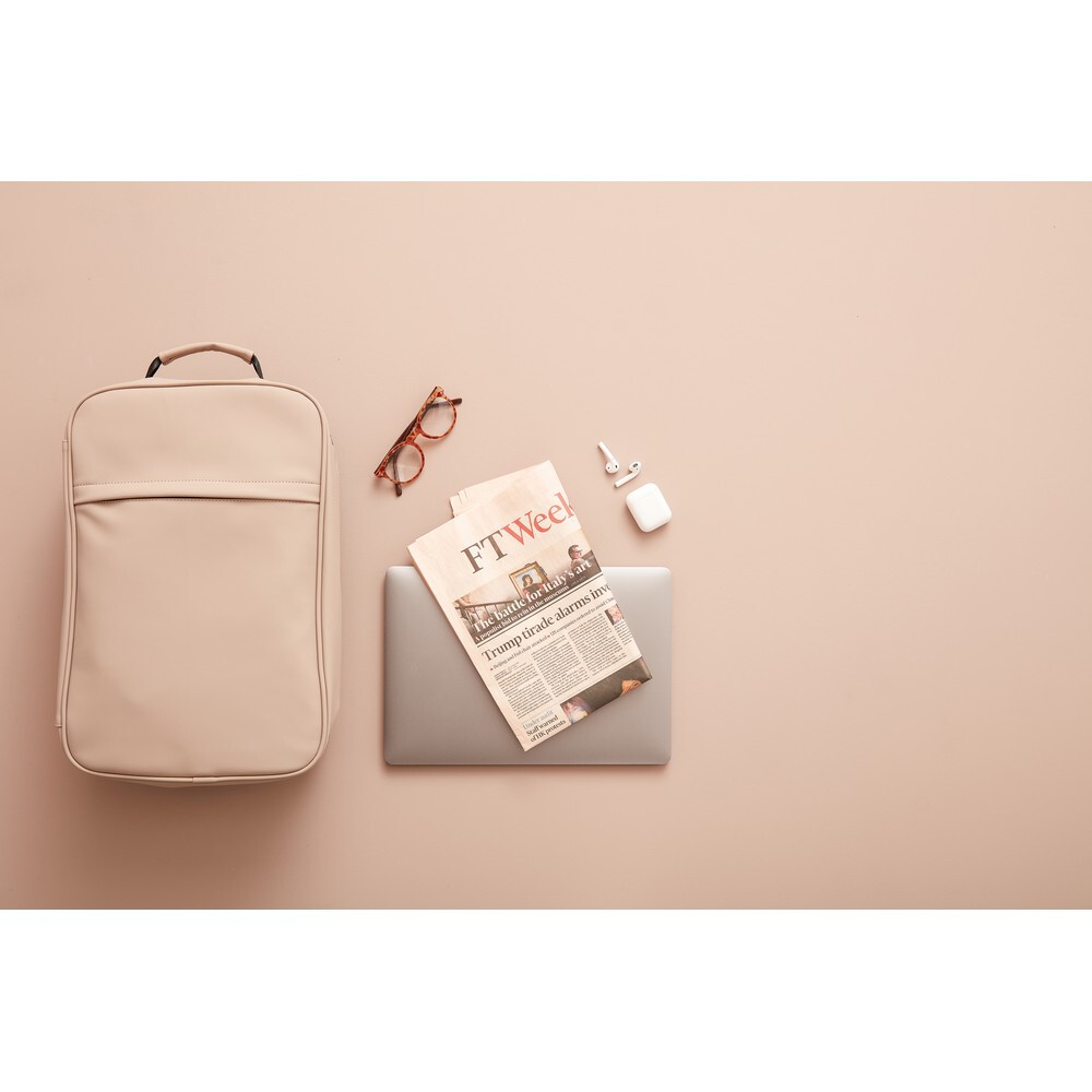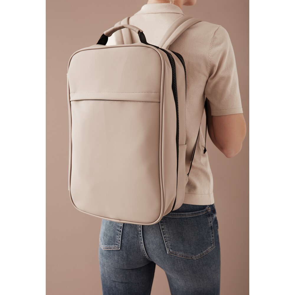 Plecak, wykonany ze skóry wegańskiej, przegroda na laptopa wewnątrz, główna przegroda z mniejszymi kieszeniami wewnątrz, ukryta kieszeń z tyłu, regulowane paski na ramiona