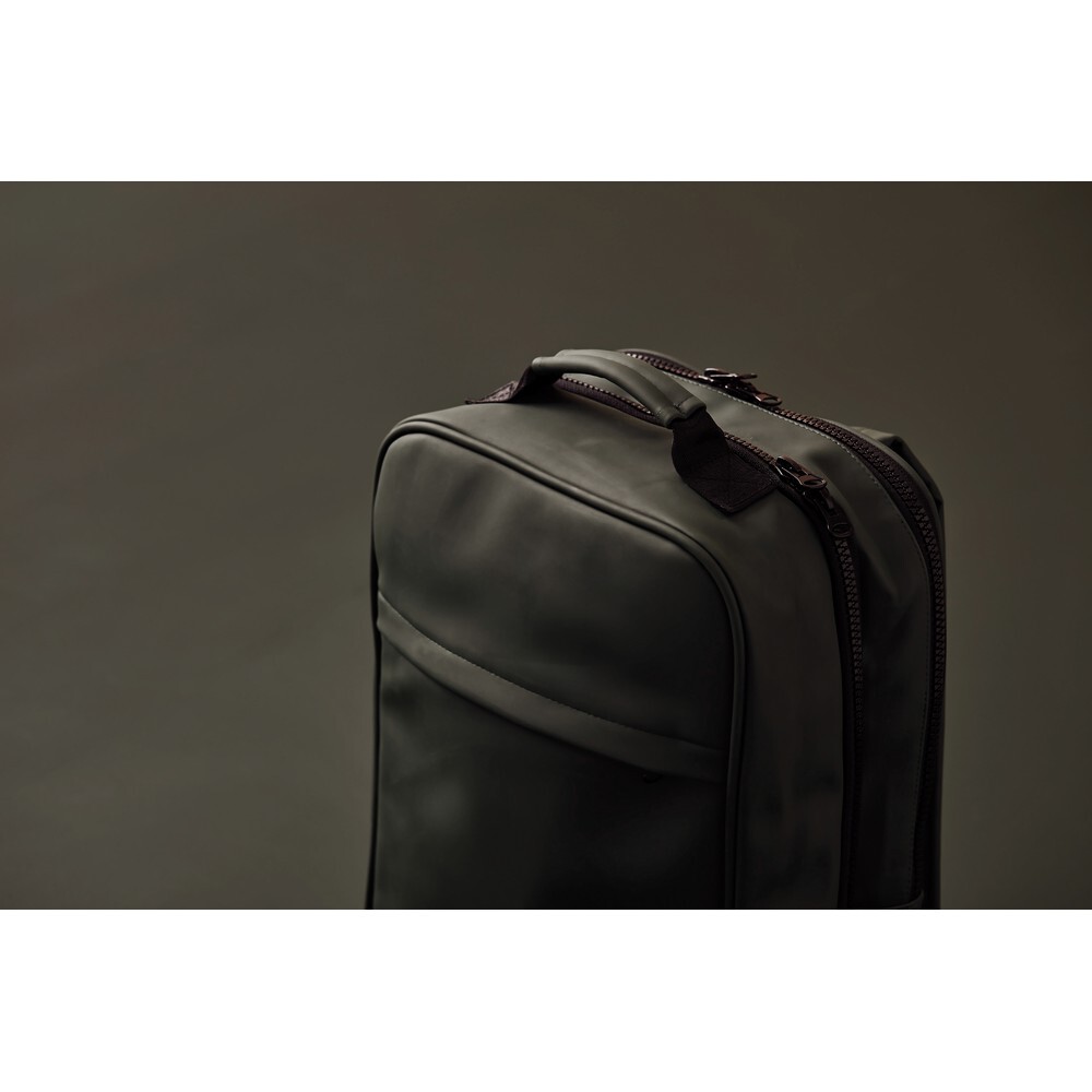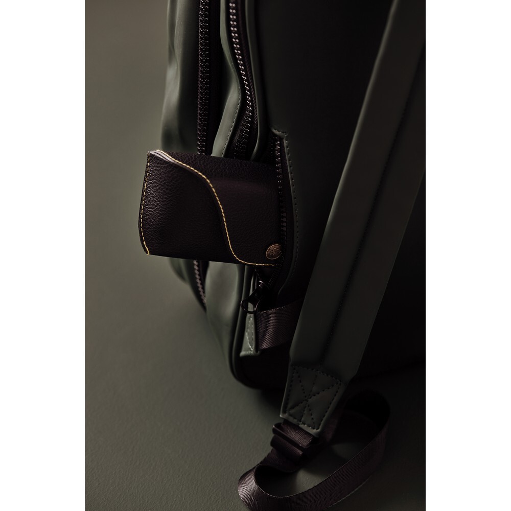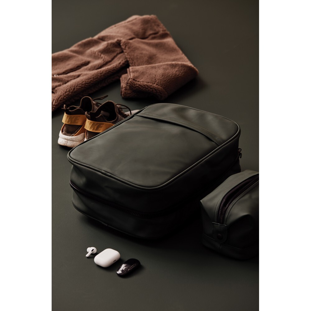 Plecak, wykonany ze skóry wegańskiej, przegroda na laptopa wewnątrz, główna przegroda z mniejszymi kieszeniami wewnątrz, ukryta kieszeń z tyłu, regulowane paski na ramiona