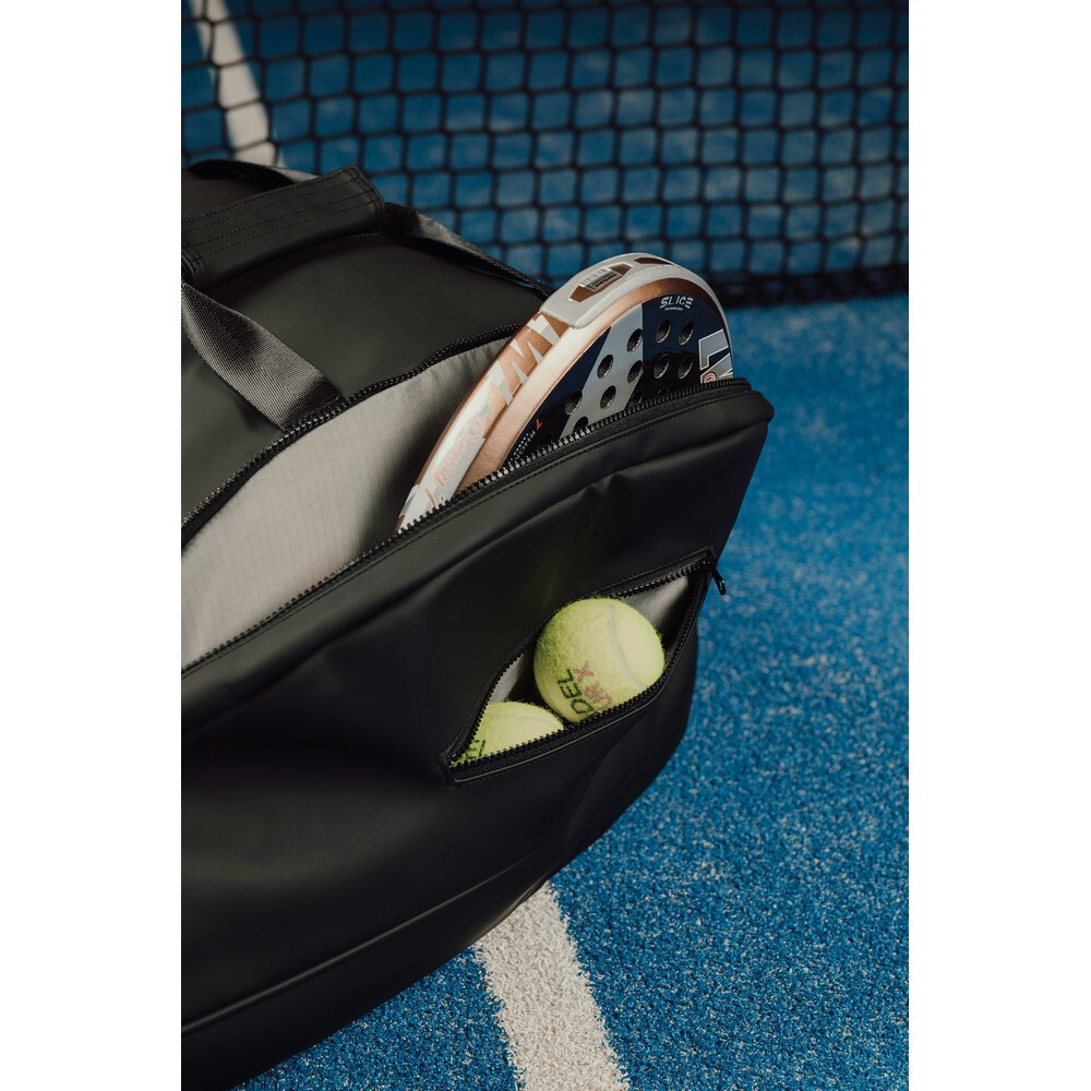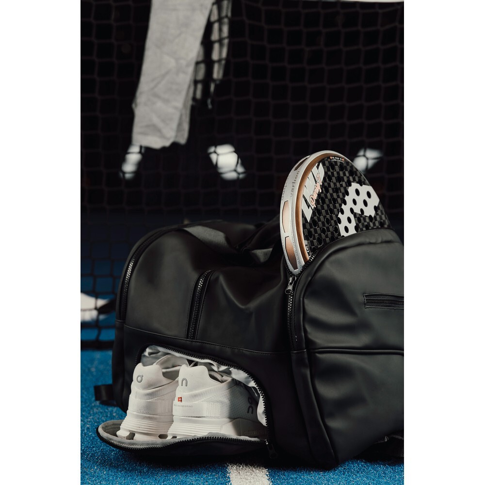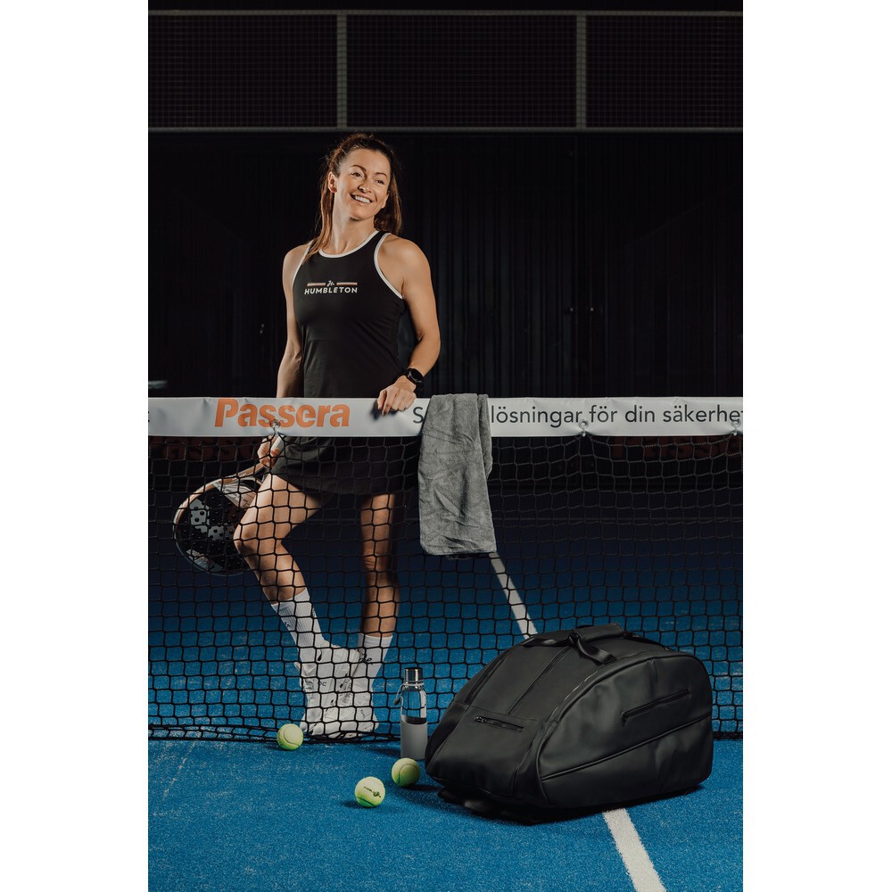 Plecak, przestronna przegroda główna z mniejszymi kieszeniami wewnątrz, z boku 2 przegrody na rakiety do gry w padla, kieszeń na buty, plecak może być używany jako torba sportowa, miękkie i regulowane paski na ramiona