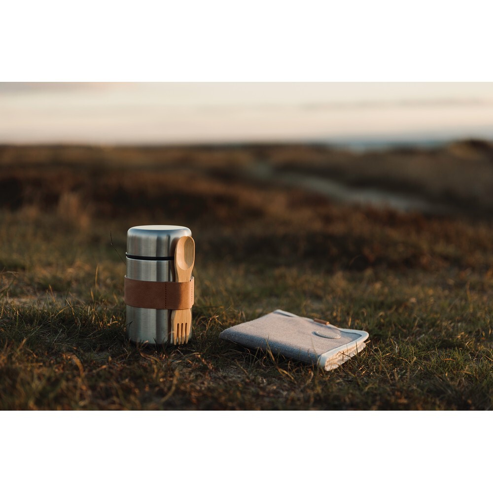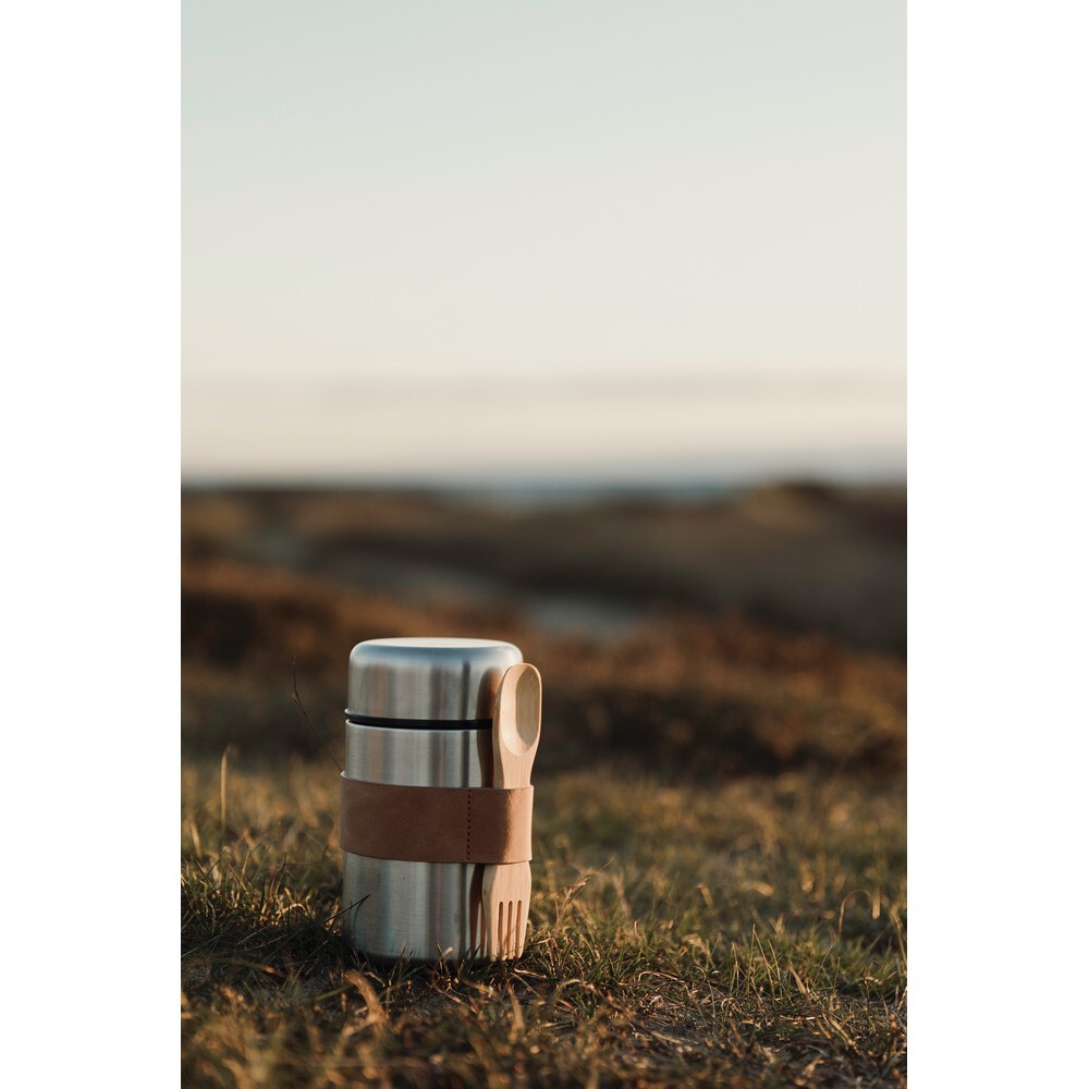 Próżniowy pojemnik na żywność, wykonany ze stali nierdzewnej, opaska oraz drewniana łyżka w komplecie