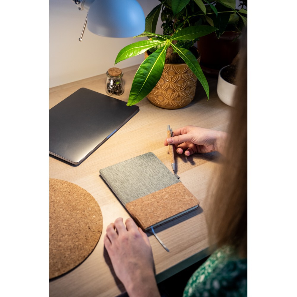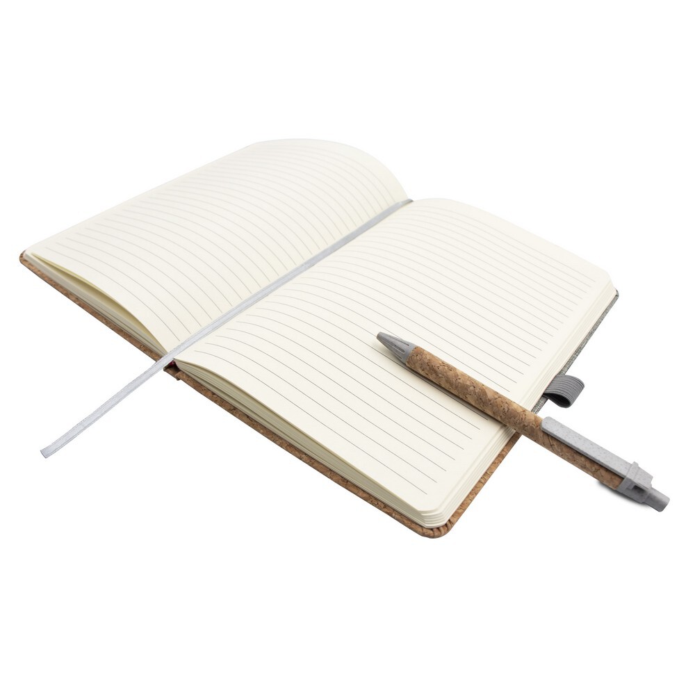 Notatnik A5 (80 kartek w linie), twarda okładka wykonana z korka i bawełny, tasiemka zakładkowa i elastyczna opaska do zamykania, długopis z korkowym trzonem i kolorowymi elementami z włókien słomy pszenicznej w komplecie