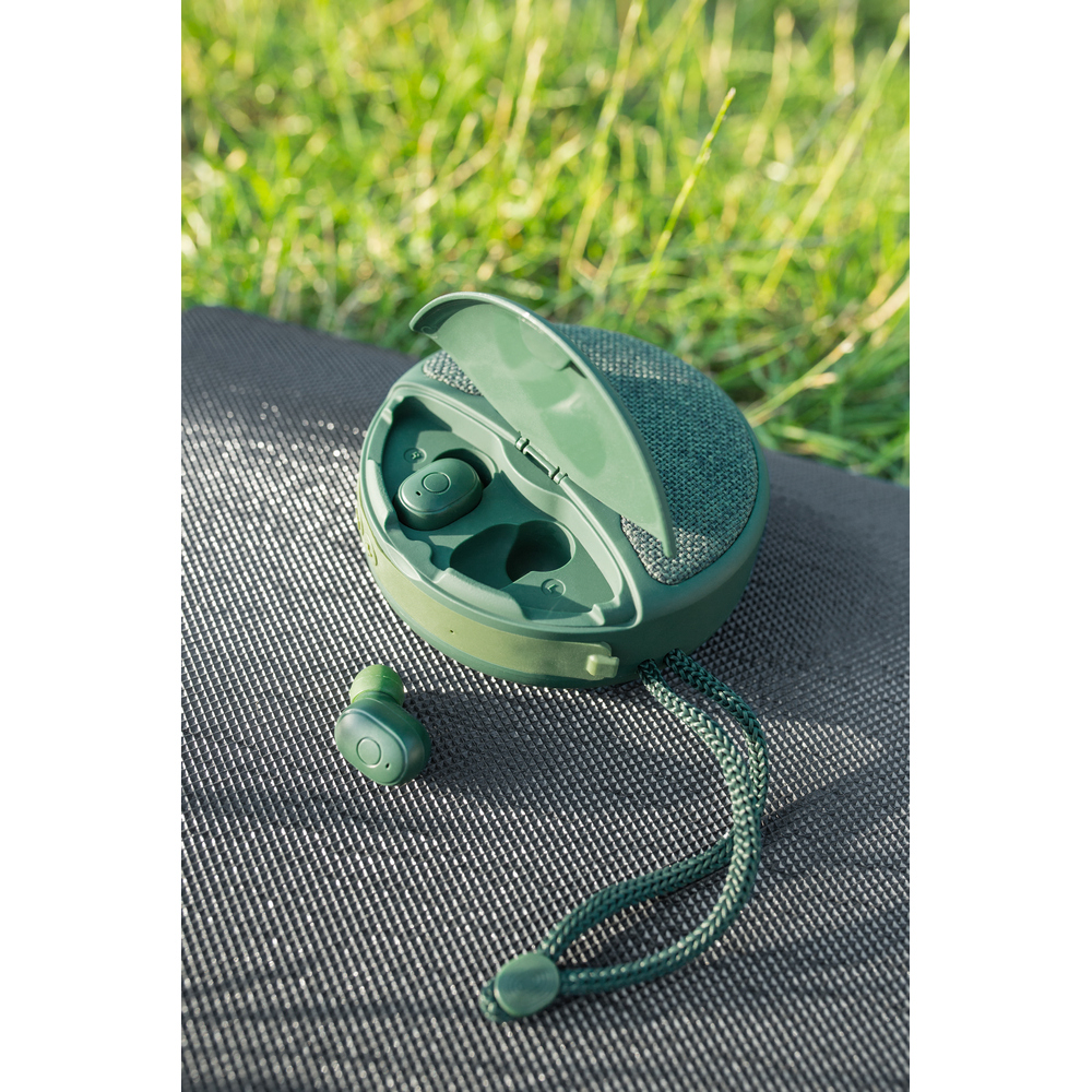 Głośnik bezprzewodowy 5W Air Gifts z bezprzewodowymi słuchawkami dousznymi w komplecie, BT 5.0, radio, czytnik kart TF/micro SD (nie dołączona), słuchawki z funkcją odbierania połączeń, bateria głośnika: 500 mAh, bateria słuchawek: 2x40 mAh, czas pracy słuchawek: ok. 3h, zasięg do 10 m, gniazdo USB, wejście audio, wejście USB typu C, ładowany przez USB, kabel USB typu C w komplecie