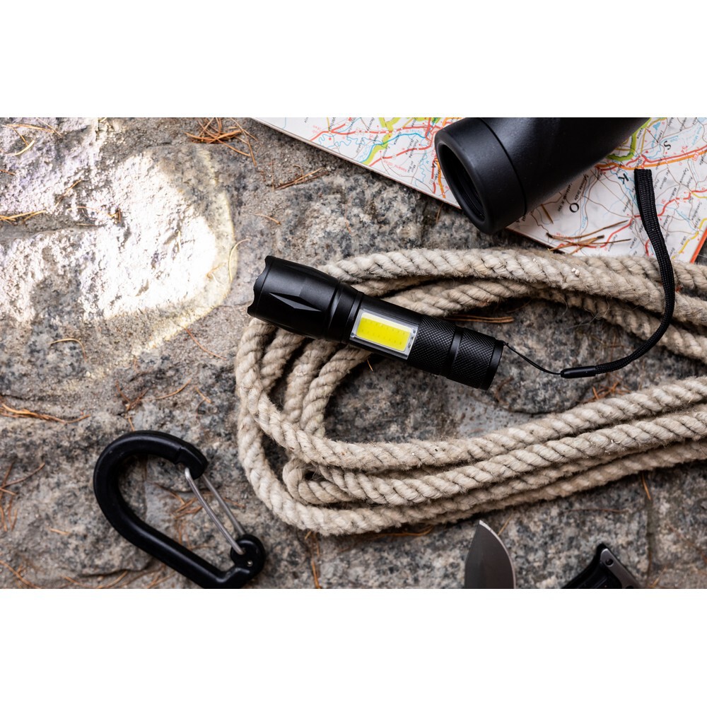 Latarka 1 LED 5W (280 lumenów), z bocznym światłem COB 3W, przycisk ON/OFF, wejście micro USB, ładowana przez USB, 4 tryby świecenia, bateria 1200mAh, ok. 4h pracy na jednym naładowaniu, pasek na rękę, kabel micro USB w komplecie