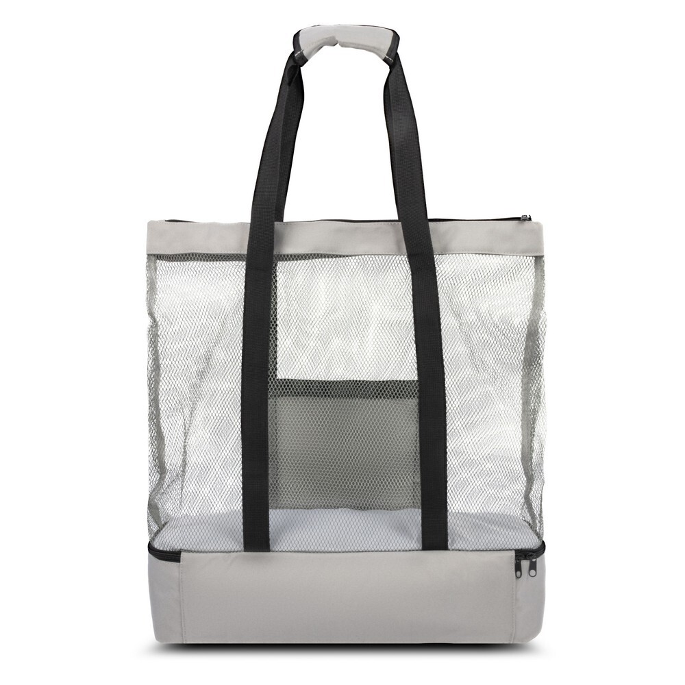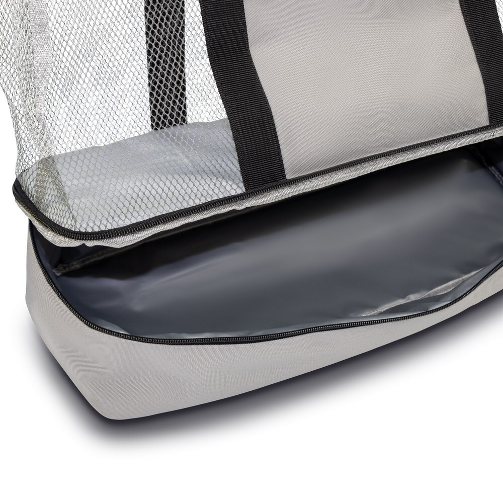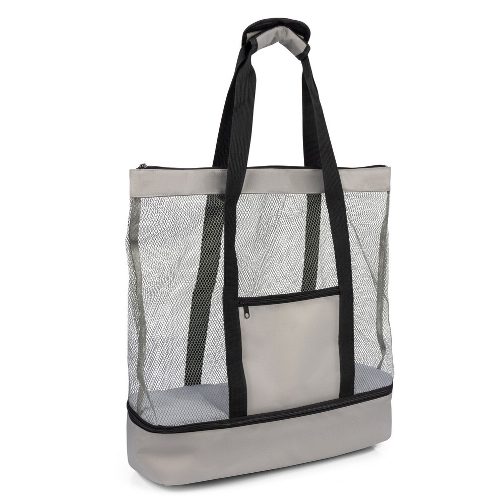 Torba plażowa, na zakupy, wykonana z poliestru RPET, z dolną przegrodą termoizolacyjną na zamek błyskawiczny, przednia kieszeń i siateczkowa przegroda główna na zamek błyskawiczny