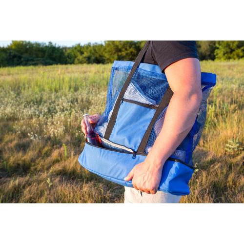 Torba plażowa, na zakupy, wykonana z poliestru RPET, z dolną przegrodą termoizolacyjną na zamek błyskawiczny, przednia kieszeń i siateczkowa przegroda główna na zamek błyskawiczny